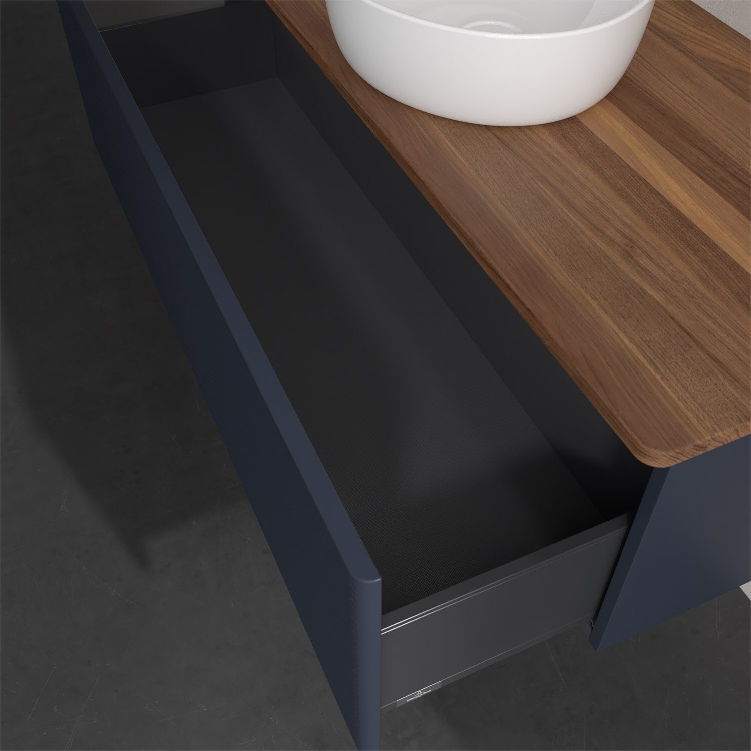 Der wandhängende Antao Waschtischunterschrank von Villeroy & Boch bietet nicht nur jede Menge Stauraum – er ist dank seines naturinspirierten Designs mit seinen abgerundeten Kanten auch noch besonders stilvoll und schafft eine gemütliche Atmosphäre im Badezimmer. Auf der Waschtischplatte bietet sich rechts und links neben dem Waschtisch viel Platz für Zahnbürstenbecher oder Seifenspender. Ein extra hoher Auszug bietet viel Platz, um alles Notwendige zu verstauen und Ordnung zu halten. Öffnen lässt er sich durch leichten Druck auf die strukturierte Front. Dank Vollauszug hat man immer alles im Blick und der Antirutschboden verhindert ein Umfallen oder Verrutschen der Gegenstände. Einfach clever! Für eine besonders leichte Pflege sorgt die mehrschichtig deckend lackierte Oberfläche. Bei der Ausführung in Massivholz wird dank des verarbeiteten Massivholzes jedes Möbel zu einem Unikat, das sich durch das lebendige Naturmaterial durch seine einzigartige Struktur und Maserung auszeichnet.