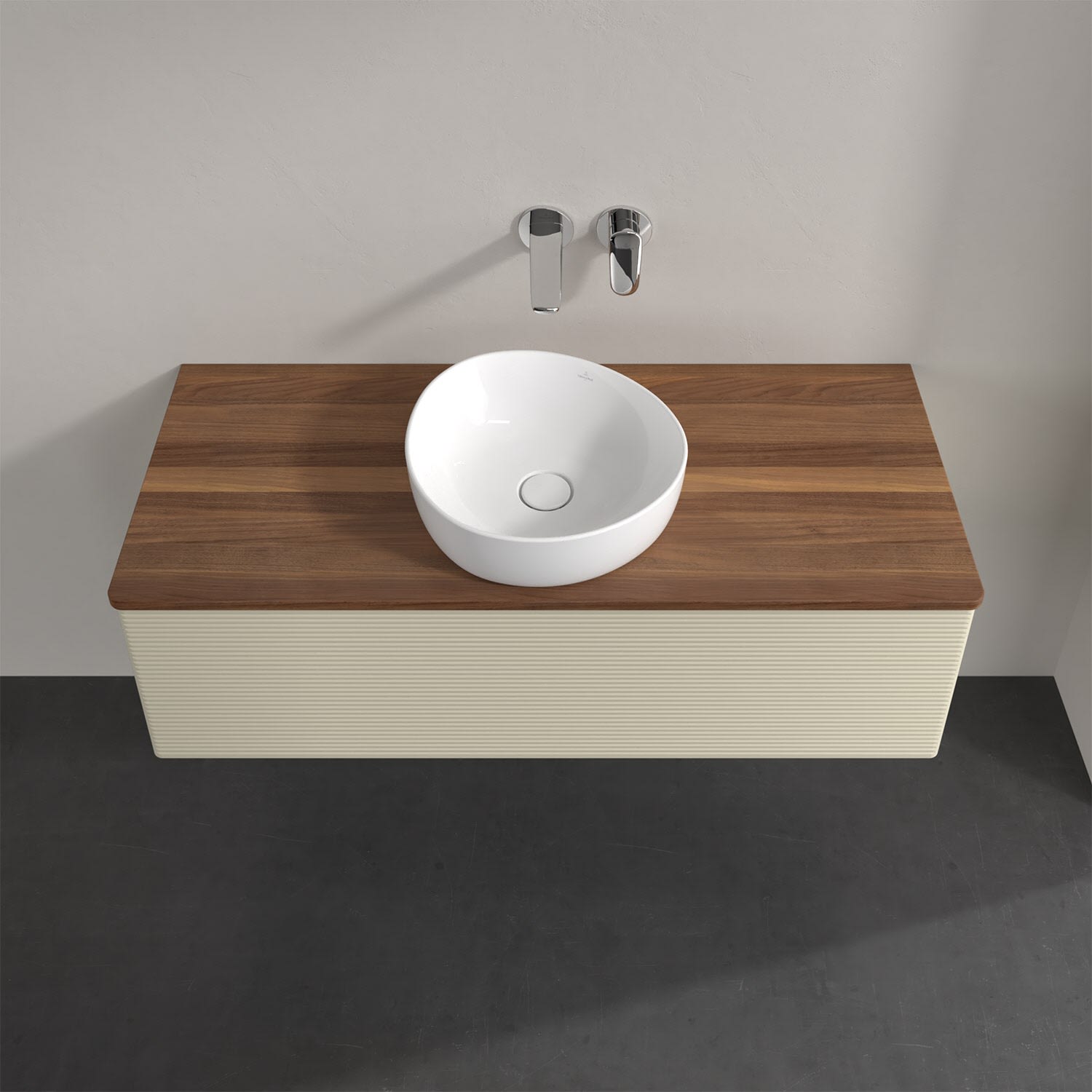 Für diesen Waschbeckenunterschrank stehen Ihnen Aufsatzwaschtische aus verschiedenen Serien zur Verfügung (siehe "Passliste" unter Downloads). Ein ausgewähltes Beispiel finden Sie im Zubehör. Den Waschtisch bitte separat mitbestellen.