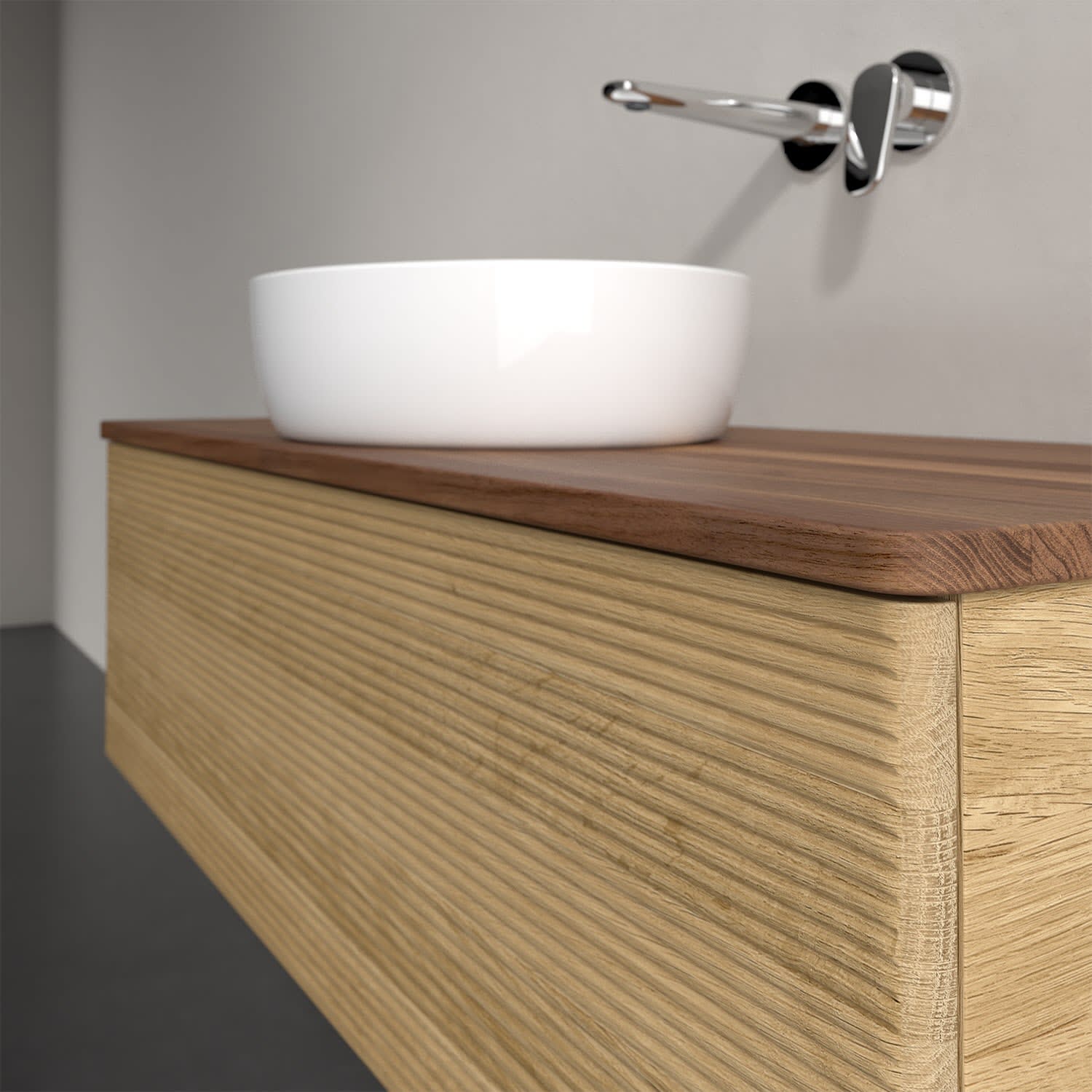 Der wandhängende Antao Waschtischunterschrank von Villeroy & Boch bietet nicht nur jede Menge Stauraum – er ist dank seines naturinspirierten Designs mit seinen abgerundeten Kanten auch noch besonders stilvoll und schafft eine gemütliche Atmosphäre im Badezimmer. Auf der Waschtischplatte bietet sich rechts und links neben dem Waschtisch viel Platz für Zahnbürstenbecher oder Seifenspender. Ein extra hoher Auszug bietet viel Platz, um alles Notwendige zu verstauen und Ordnung zu halten. Öffnen lässt er sich durch leichten Druck auf die strukturierte Front. Dank Vollauszug hat man immer alles im Blick und der Antirutschboden verhindert ein Umfallen oder Verrutschen der Gegenstände. Einfach clever! Für eine besonders leichte Pflege sorgt die mehrschichtig deckend lackierte Oberfläche. Bei der Ausführung in Massivholz wird dank des verarbeiteten Massivholzes jedes Möbel zu einem Unikat, das sich durch das lebendige Naturmaterial durch seine einzigartige Struktur und Maserung auszeichnet.
