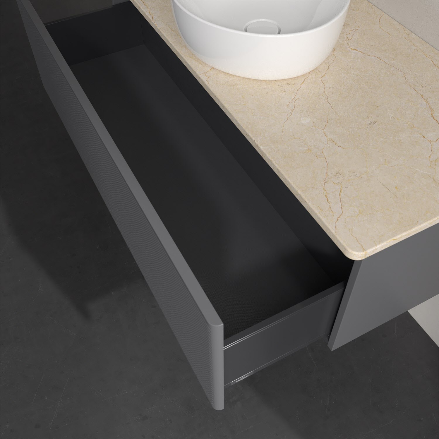- kein Umfallen oder Verrutschen von Pflegeprodukten in den Schubladen dank rutschhemmendem Boden