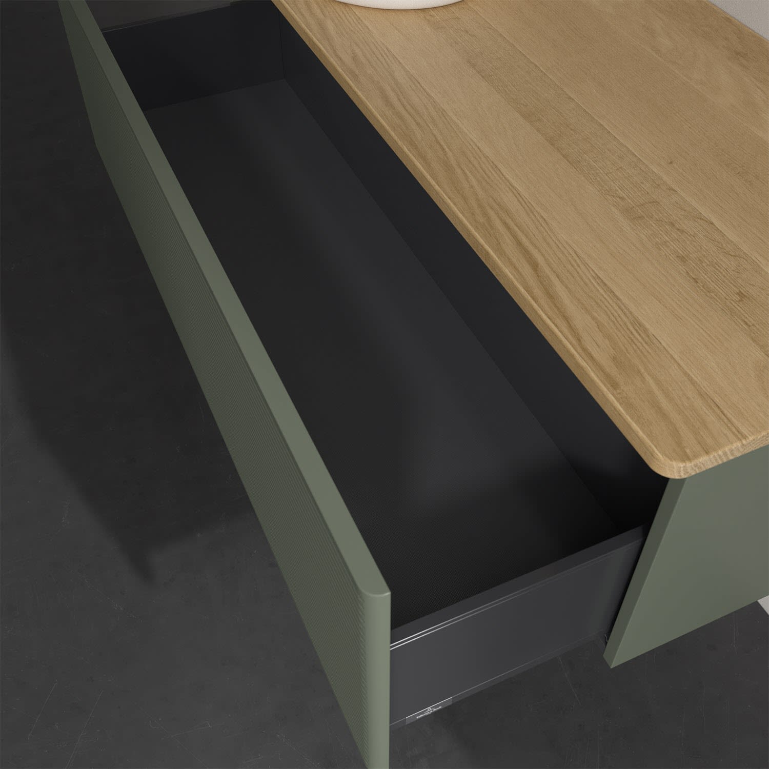 Der wandhängende Antao Waschtischunterschrank von Villeroy & Boch bietet nicht nur jede Menge Stauraum – er ist dank seines naturinspirierten Designs mit seinen abgerundeten Kanten auch noch besonders stilvoll und schafft eine gemütliche Atmosphäre im Badezimmer. Auf der Waschtischplatte bietet sich seitlich des Waschtischs viel Platz für Zahnbürstenbecher oder Seifenspender. Ein extra hoher Auszug bietet viel Platz, um alles Notwendige zu verstauen und Ordnung zu halten. Öffnen lässt er sich durch leichten Druck auf die strukturierte Front. Dank Vollauszug hat man immer alles im Blick und der Antirutschboden verhindert ein Umfallen oder Verrutschen der Gegenstände. Einfach clever! Für eine besonders leichte Pflege sorgt die mehrschichtig deckend lackierte Oberfläche. Bei der Ausführung in Massivholz wird dank des verarbeiteten Massivholzes jedes Möbel zu einem Unikat, das sich durch das lebendige Naturmaterial durch seine einzigartige Struktur und Maserung auszeichnet.