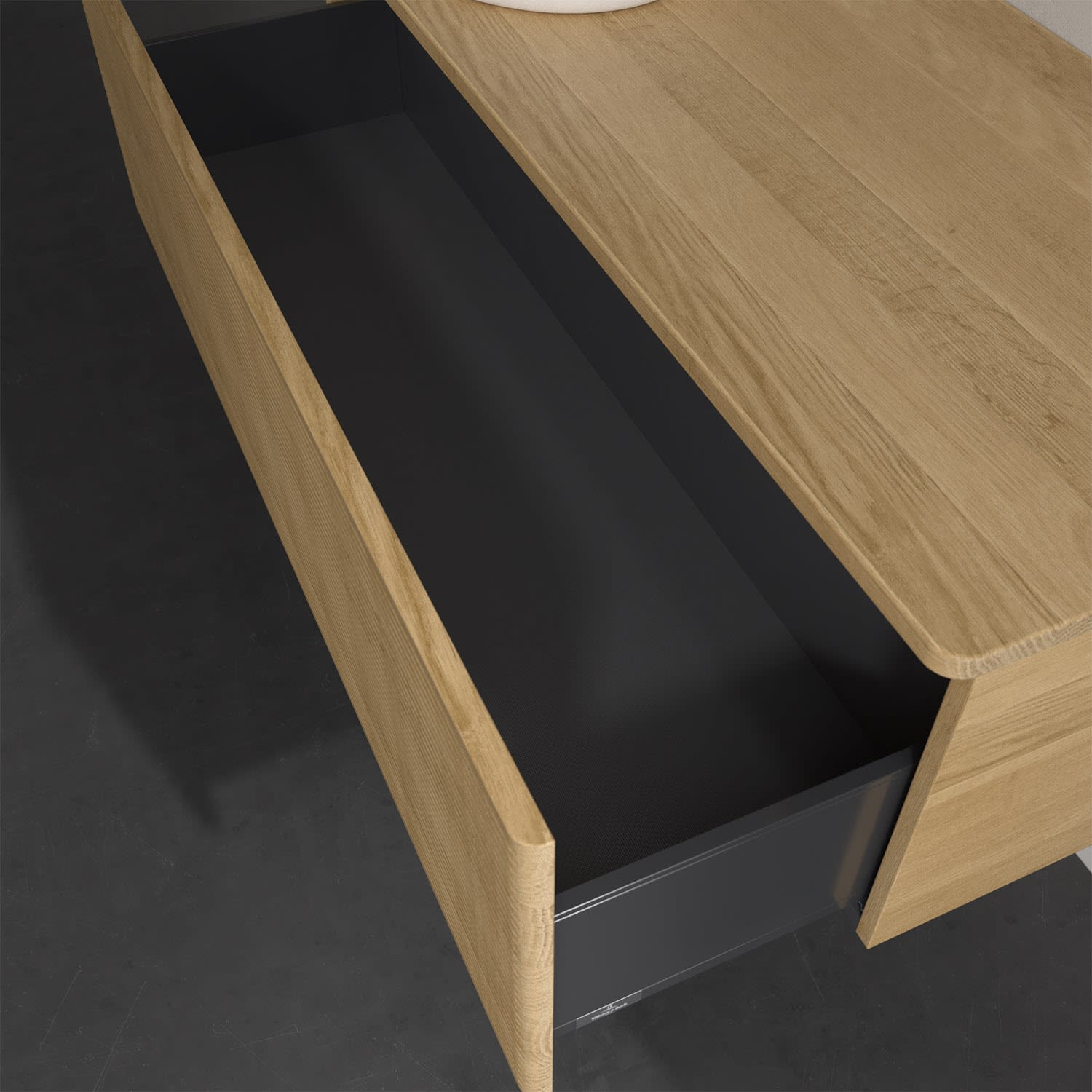 Der wandhängende Antao Waschtischunterschrank von Villeroy & Boch bietet nicht nur jede Menge Stauraum – er ist dank seines naturinspirierten Designs mit seinen abgerundeten Kanten auch noch besonders stilvoll und schafft eine gemütliche Atmosphäre im Badezimmer. Auf der Waschtischplatte bietet sich seitlich des Waschtischs viel Platz für Zahnbürstenbecher oder Seifenspender. Ein extra hoher Auszug bietet viel Platz, um alles Notwendige zu verstauen und Ordnung zu halten. Öffnen lässt er sich durch leichten Druck auf die strukturierte Front. Dank Vollauszug hat man immer alles im Blick und der Antirutschboden verhindert ein Umfallen oder Verrutschen der Gegenstände. Einfach clever! Für eine besonders leichte Pflege sorgt die mehrschichtig deckend lackierte Oberfläche. Bei der Ausführung in Massivholz wird dank des verarbeiteten Massivholzes jedes Möbel zu einem Unikat, das sich durch das lebendige Naturmaterial durch seine einzigartige Struktur und Maserung auszeichnet.