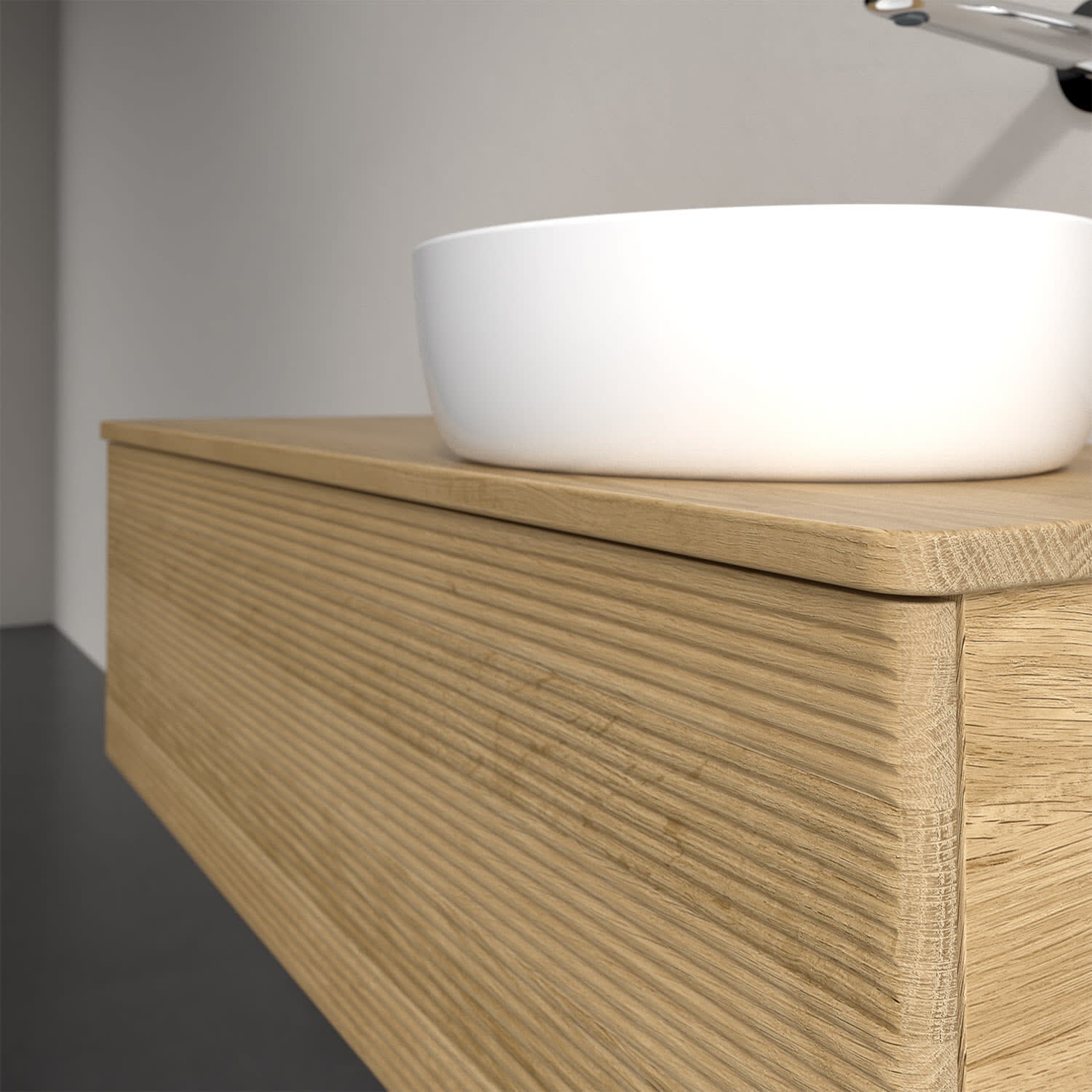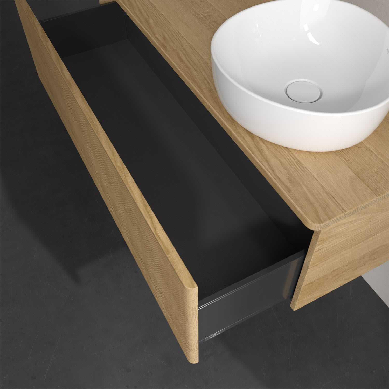 Der wandhängende Antao Waschtischunterschrank von Villeroy & Boch bietet nicht nur jede Menge Stauraum – er ist dank seines naturinspirierten Designs mit seinen abgerundeten Kanten auch noch besonders stilvoll und schafft eine gemütliche Atmosphäre im Badezimmer. Auf der Waschtischplatte bietet sich seitlich des Waschtischs viel Platz für Zahnbürstenbecher oder Seifenspender. Ein extra hoher Auszug bietet viel Platz, um alles Notwendige zu verstauen und Ordnung zu halten. Öffnen lässt er sich durch leichten Druck auf die strukturierte Front. Dank Vollauszug hat man immer alles im Blick und der Antirutschboden verhindert ein Umfallen oder Verrutschen der Gegenstände. Einfach clever! Für eine besonders leichte Pflege sorgt die mehrschichtig deckend lackierte Oberfläche. Bei der Ausführung in Massivholz wird dank des verarbeiteten Massivholzes jedes Möbel zu einem Unikat, das sich durch das lebendige Naturmaterial durch seine einzigartige Struktur und Maserung auszeichnet.