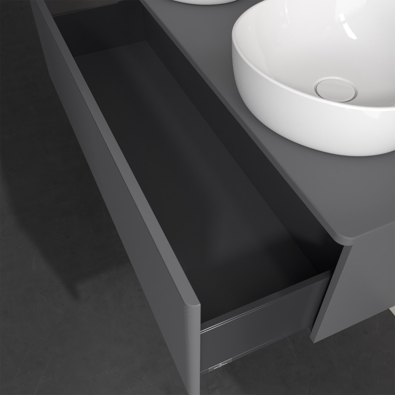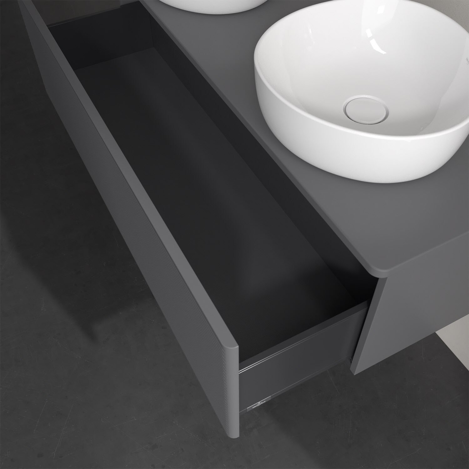 Der wandhängende Antao Waschtischunterschrank von Villeroy & Boch bietet nicht nur jede Menge Stauraum – er ist dank seines naturinspirierten Designs mit seinen abgerundeten Kanten auch noch besonders stilvoll und schafft eine gemütliche Atmosphäre im Badezimmer. Kombiniert mit zwei passenden Aufsatzwaschtischen also die ideale Wahl. Ein extra hoher Auszug bietet viel Platz, um alles Notwendige zu verstauen und Ordnung zu halten. Öffnen lässt er sich durch leichten Druck auf die strukturierte Front. Dank Vollauszug hat man immer alles im Blick und der Antirutschboden verhindert ein Umfallen oder Verrutschen der Gegenstände. Einfach clever! Für eine besonders leichte Pflege sorgt die mehrschichtig deckend lackierte Oberfläche.