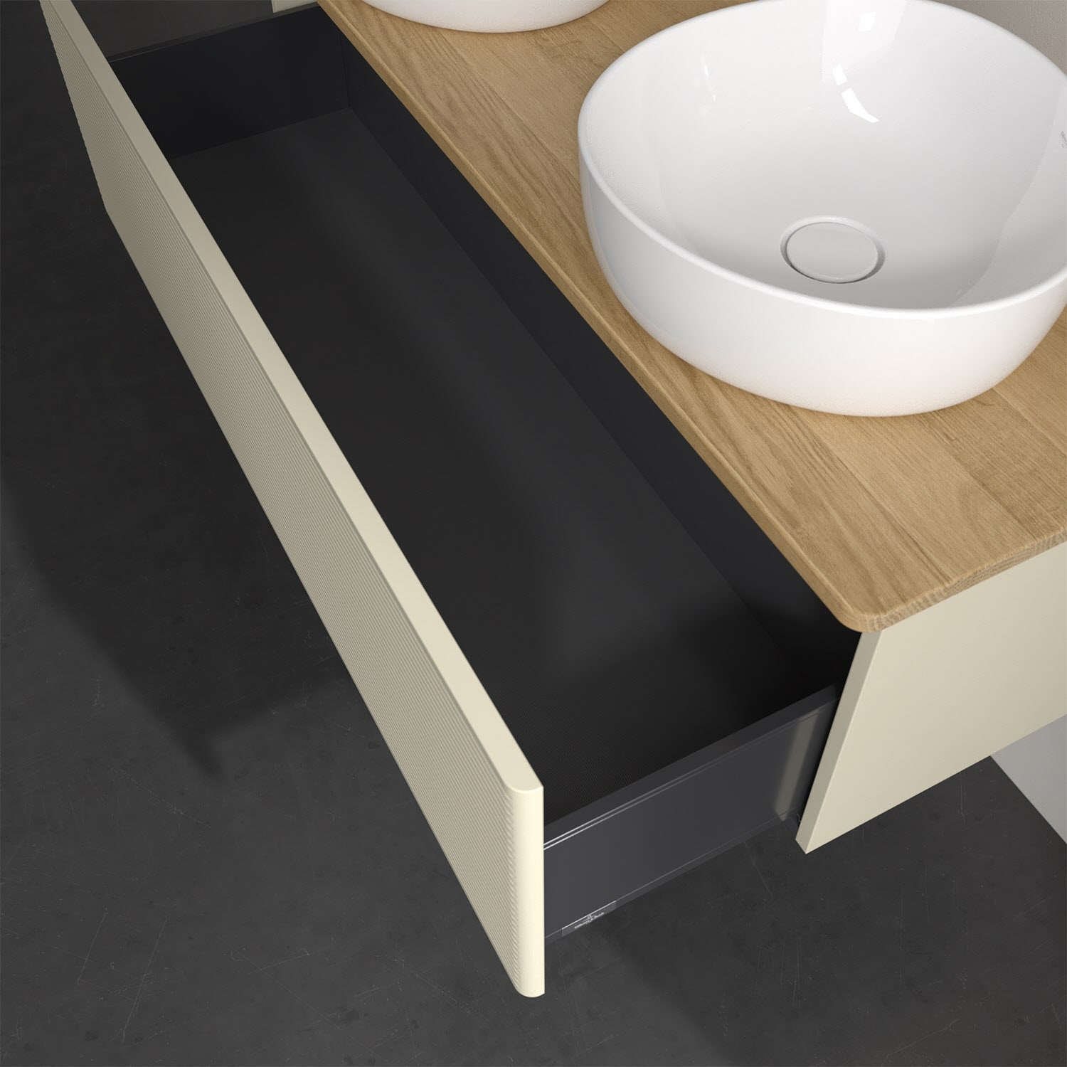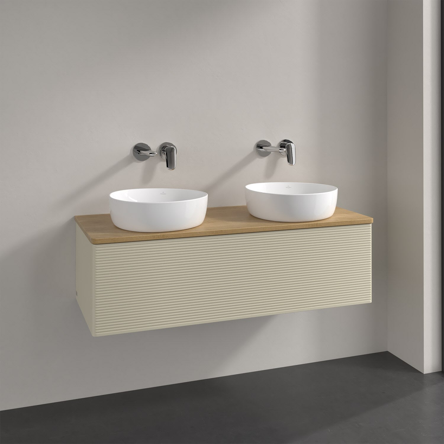Der wandhängende Antao Waschtischunterschrank von Villeroy & Boch bietet nicht nur jede Menge Stauraum – er ist dank seines naturinspirierten Designs mit seinen abgerundeten Kanten auch noch besonders stilvoll und schafft eine gemütliche Atmosphäre im Badezimmer. Kombiniert mit zwei passenden Aufsatzwaschtischen also die ideale Wahl. Ein extra hoher Auszug bietet viel Platz, um alles Notwendige zu verstauen und Ordnung zu halten. Öffnen lässt er sich durch leichten Druck auf die strukturierte Front. Dank Vollauszug hat man immer alles im Blick und der Antirutschboden verhindert ein Umfallen oder Verrutschen der Gegenstände. Einfach clever! Für eine besonders leichte Pflege sorgt die mehrschichtig deckend lackierte Oberfläche. Bei der Ausführung in Massivholz wird dank des verarbeiteten Massivholzes jedes Möbel zu einem Unikat, das sich durch das lebendige Naturmaterial durch seine einzigartige Struktur und Maserung auszeichnet.
