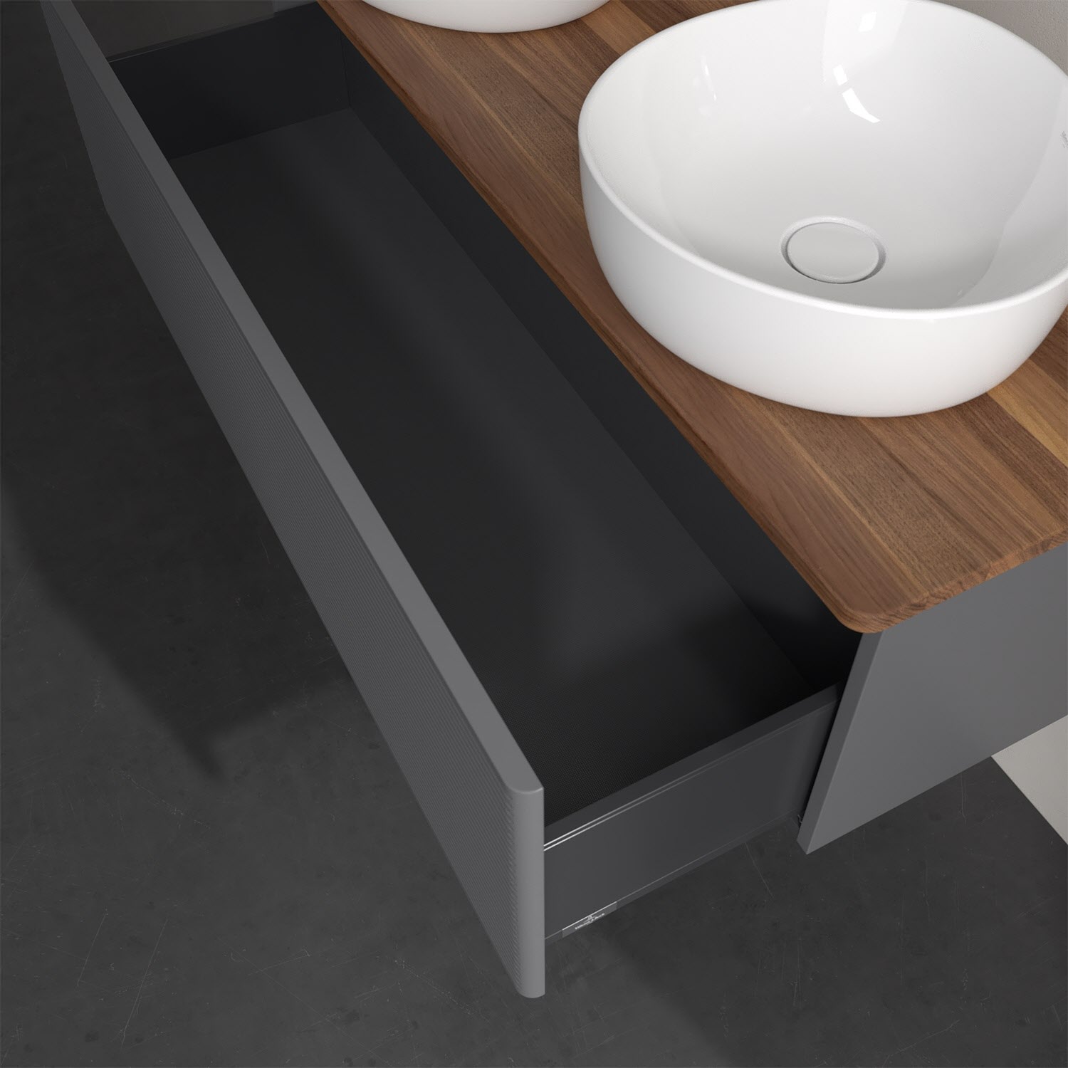 Der wandhängende Antao Waschtischunterschrank von Villeroy & Boch bietet nicht nur jede Menge Stauraum – er ist dank seines naturinspirierten Designs mit seinen abgerundeten Kanten auch noch besonders stilvoll und schafft eine gemütliche Atmosphäre im Badezimmer. Kombiniert mit zwei passenden Aufsatzwaschtischen also die ideale Wahl. Ein extra hoher Auszug bietet viel Platz, um alles Notwendige zu verstauen und Ordnung zu halten. Öffnen lässt er sich durch leichten Druck auf die strukturierte Front. Dank Vollauszug hat man immer alles im Blick und der Antirutschboden verhindert ein Umfallen oder Verrutschen der Gegenstände. Einfach clever! Für eine besonders leichte Pflege sorgt die mehrschichtig deckend lackierte Oberfläche. Bei der Ausführung in Massivholz wird dank des verarbeiteten Massivholzes jedes Möbel zu einem Unikat, das sich durch das lebendige Naturmaterial durch seine einzigartige Struktur und Maserung auszeichnet.