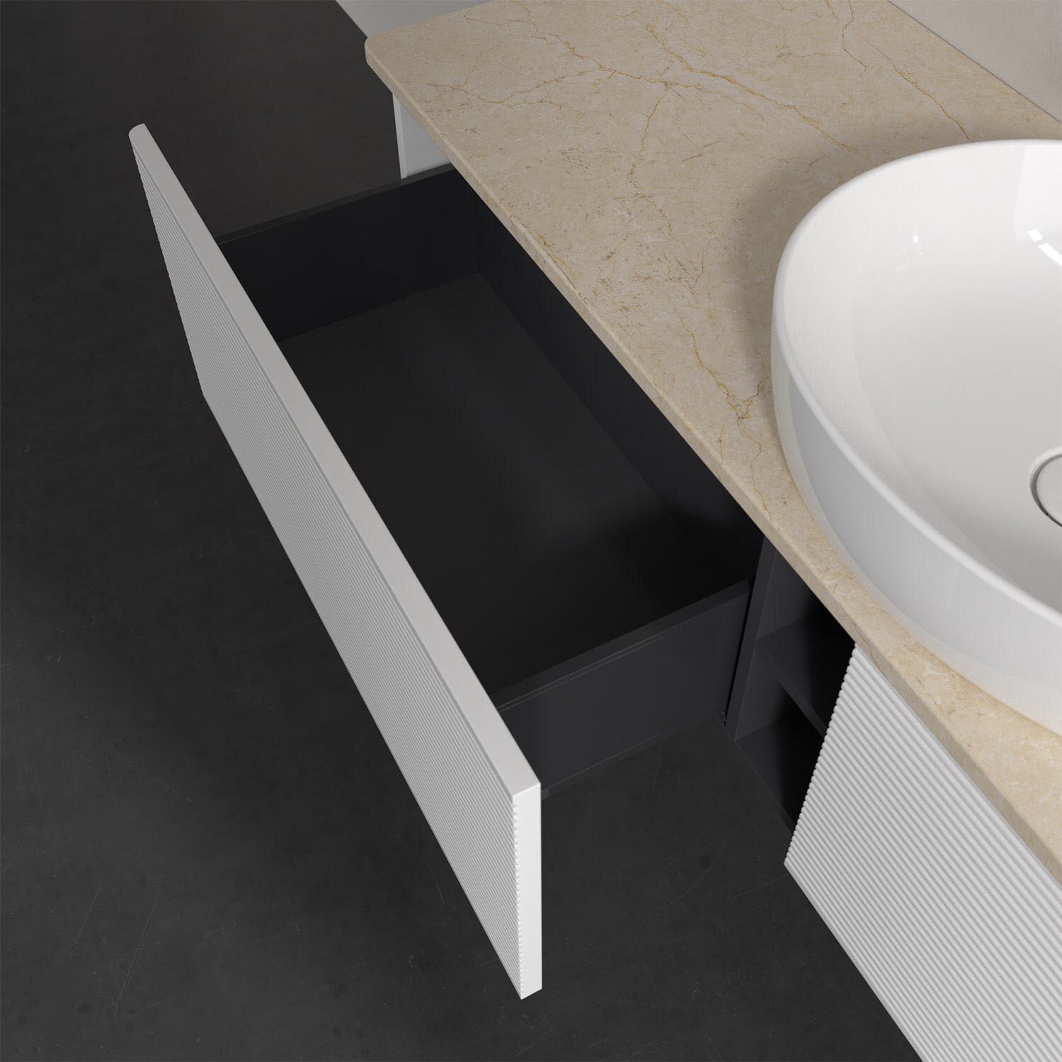 - kein Umfallen oder Verrutschen von Pflegeprodukten in den Schubladen dank rutschhemmendem Boden
