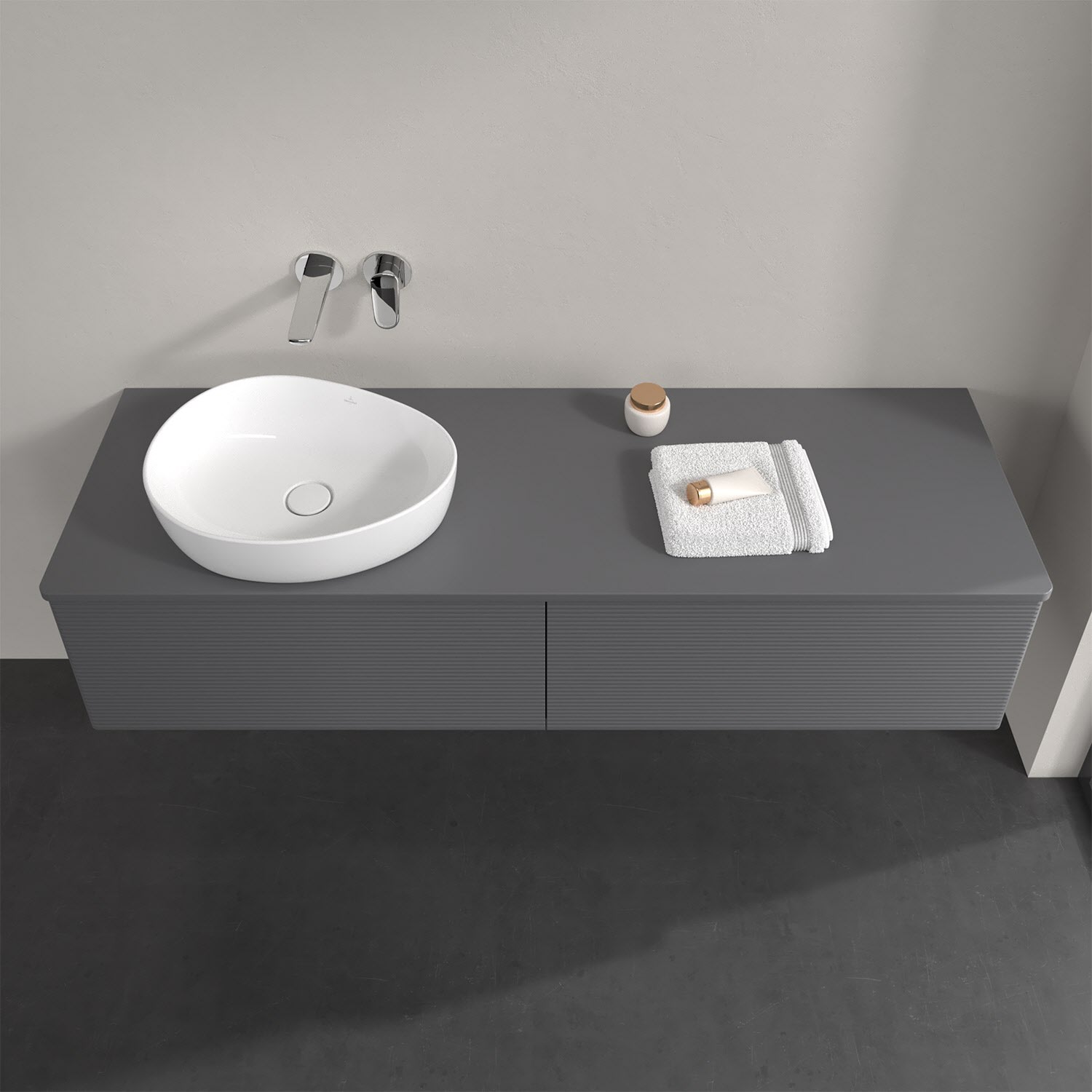 Der wandhängende Antao Waschtischunterschrank bietet mit seinen beiden extra hohen Auszügen und seiner erstaunlichen Größe viel Platz zum Verstauen von Utensilien im Badezimmer. Dank des seitlich platzierten Aufsatzwaschtischs gibt es daneben weiteren Platz für Handtücher, Seifenspender & Co. auf der Waschtischplatte. Inspiriert von der Natur überzeugt der Unterschrank auch optisch mit sanfter Formsprache und abgerundete Kanten. Die grifflosen Auszüge mit strukturierter Front sind mit der Push-to-Open Funktion ausgestattet und verfügen über einen Antirutschboden, damit Utensilien sicher verstaut werden können. Mit seiner Vollauszug- und Selbsteinzug-Funktion ist der Schrank praktisch und leicht zu bedienen. Qualität von Villeroy & Boch! Für eine besonders leichte Pflege sorgt die mehrschichtig deckend lackierte Oberfläche.