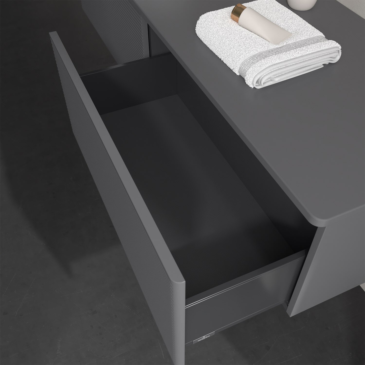 - kein Umfallen oder Verrutschen von Pflegeprodukten in den Schubladen dank rutschhemmendem Boden