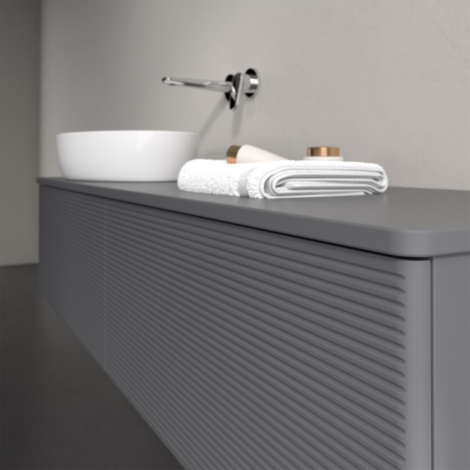Der wandhängende Antao Waschtischunterschrank bietet mit seinen beiden extra hohen Auszügen und seiner erstaunlichen Größe viel Platz zum Verstauen von Utensilien im Badezimmer. Dank des seitlich platzierten Aufsatzwaschtischs gibt es daneben weiteren Platz für Handtücher, Seifenspender & Co. auf der Waschtischplatte. Inspiriert von der Natur überzeugt der Unterschrank auch optisch mit sanfter Formsprache und abgerundete Kanten. Die grifflosen Auszüge mit strukturierter Front sind mit der Push-to-Open Funktion ausgestattet und verfügen über einen Antirutschboden, damit Utensilien sicher verstaut werden können. Mit seiner Vollauszug- und Selbsteinzug-Funktion ist der Schrank praktisch und leicht zu bedienen. Qualität von Villeroy & Boch! Für eine besonders leichte Pflege sorgt die mehrschichtig deckend lackierte Oberfläche.