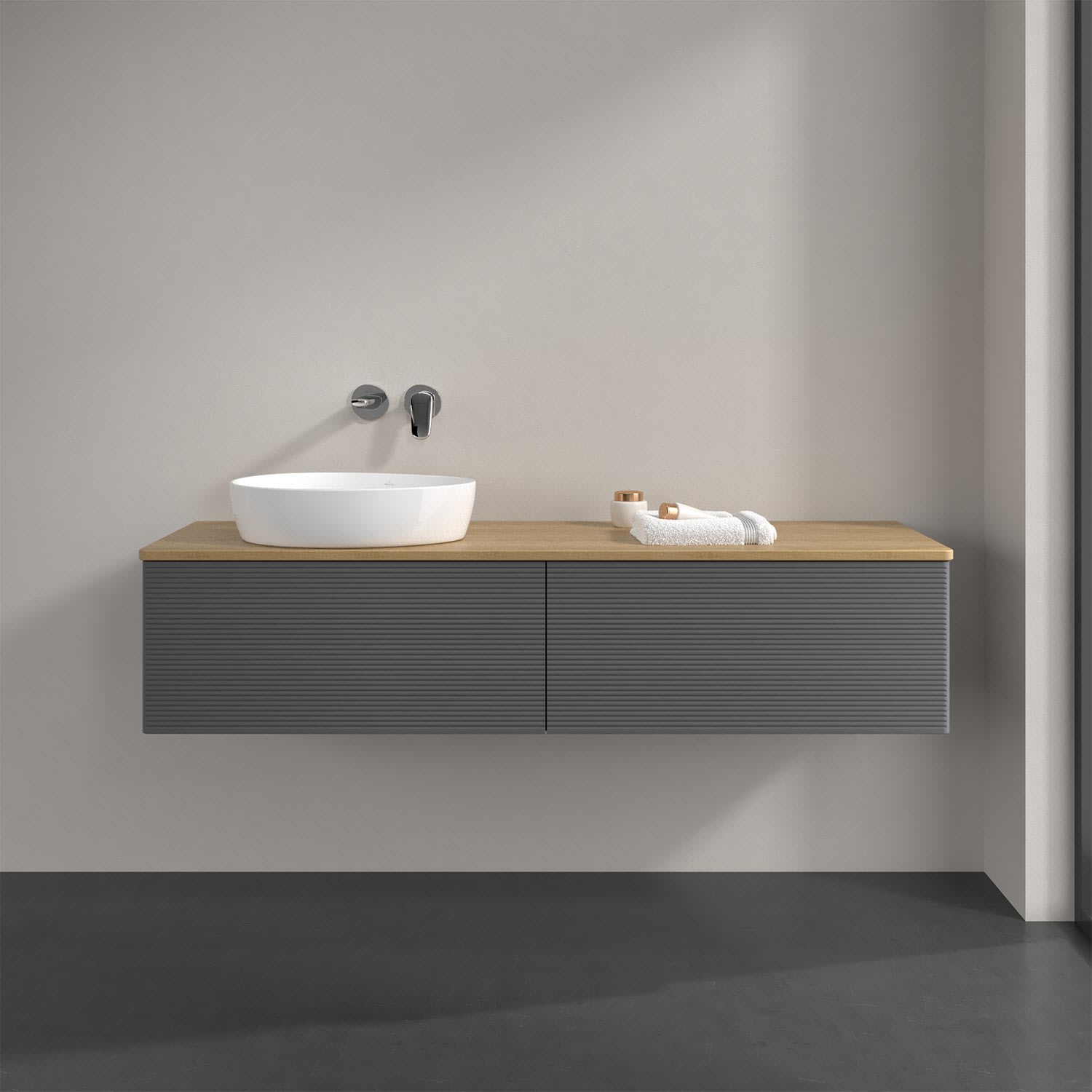 Villeroy & Boch Antao Waschbeckenunterschrank, 160 x 36 cm, 2 Auszüge, Front mit Struktur, ohne Hahnloch, für Waschtisch links