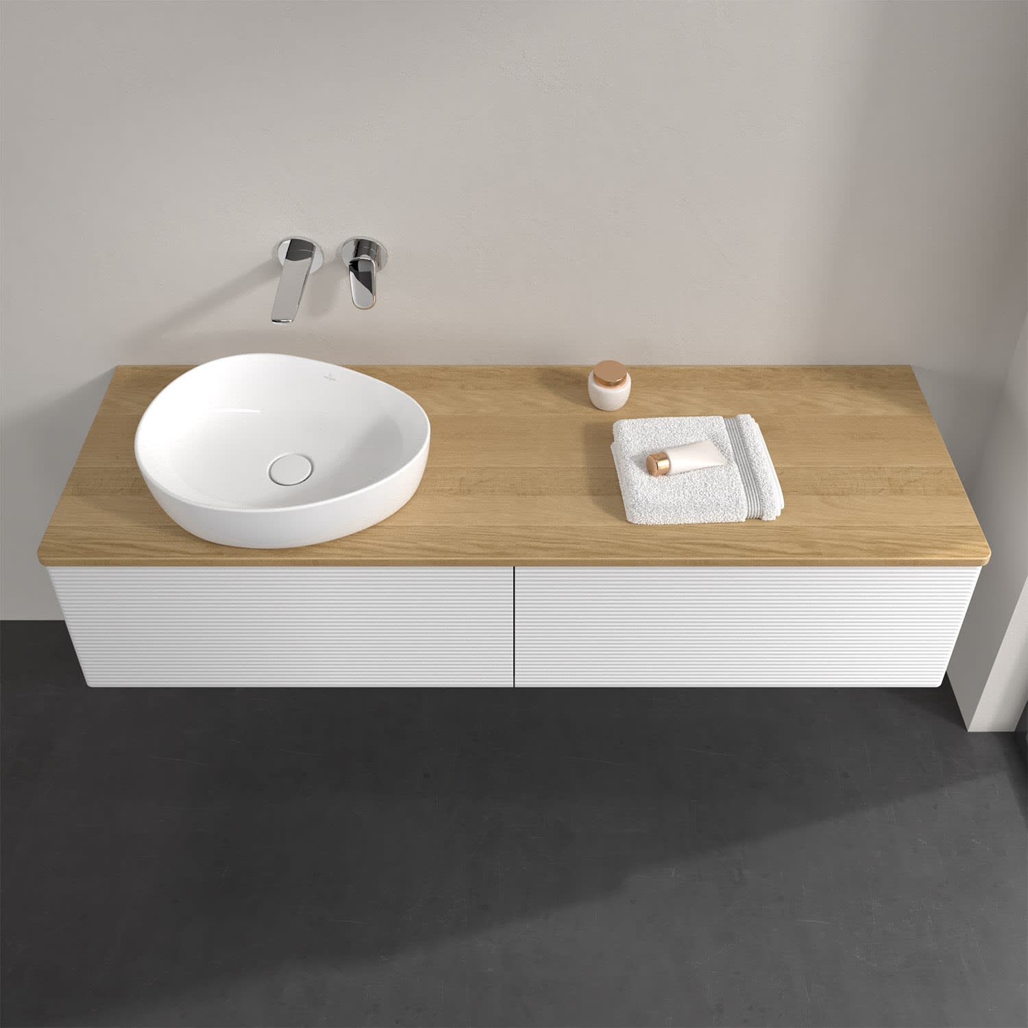 Villeroy & Boch Antao Waschbeckenunterschrank, 160 x 36 cm, 2 Auszüge, Front mit Struktur, ohne Hahnloch, für Waschtisch links