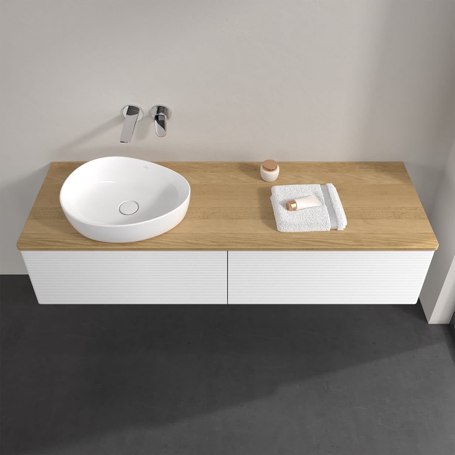 Der wandhängende Antao Waschtischunterschrank bietet mit seinen beiden extra hohen Auszügen und seiner erstaunlichen Größe viel Platz zum Verstauen von Utensilien im Badezimmer. Dank des seitlich platzierten Aufsatzwaschtischs gibt es daneben weiteren Platz für Handtücher, Seifenspender & Co. auf der Waschtischplatte. Inspiriert von der Natur überzeugt der Unterschrank auch optisch mit sanfter Formsprache und abgerundete Kanten. Die grifflosen Auszüge mit strukturierter Front sind mit der Push-to-Open Funktion ausgestattet und verfügen über einen Antirutschboden, damit Utensilien sicher verstaut werden können. Mit seiner Vollauszug- und Selbsteinzug-Funktion ist der Schrank praktisch und leicht zu bedienen. Qualität von Villeroy & Boch! Für eine besonders leichte Pflege sorgt die mehrschichtig deckend lackierte Oberfläche. Bei der Ausführung in Massivholz wird dank des verarbeiteten Massivholzes jedes Möbel zu einem Unikat, das sich durch das lebendige Naturmaterial durch seine einzigartige Struktur und Maserung auszeichnet.
