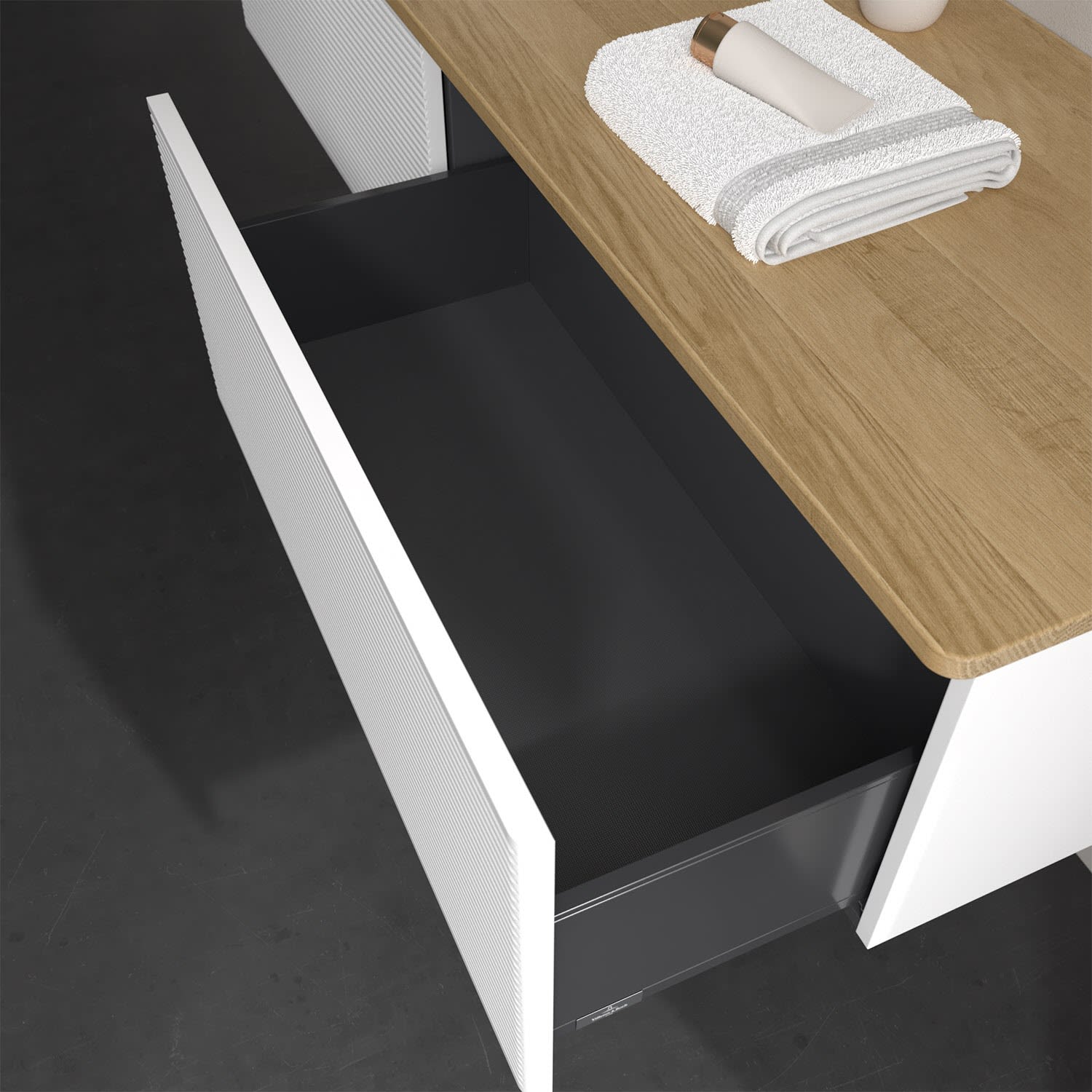- kein Umfallen oder Verrutschen von Pflegeprodukten in den Schubladen dank rutschhemmendem Boden