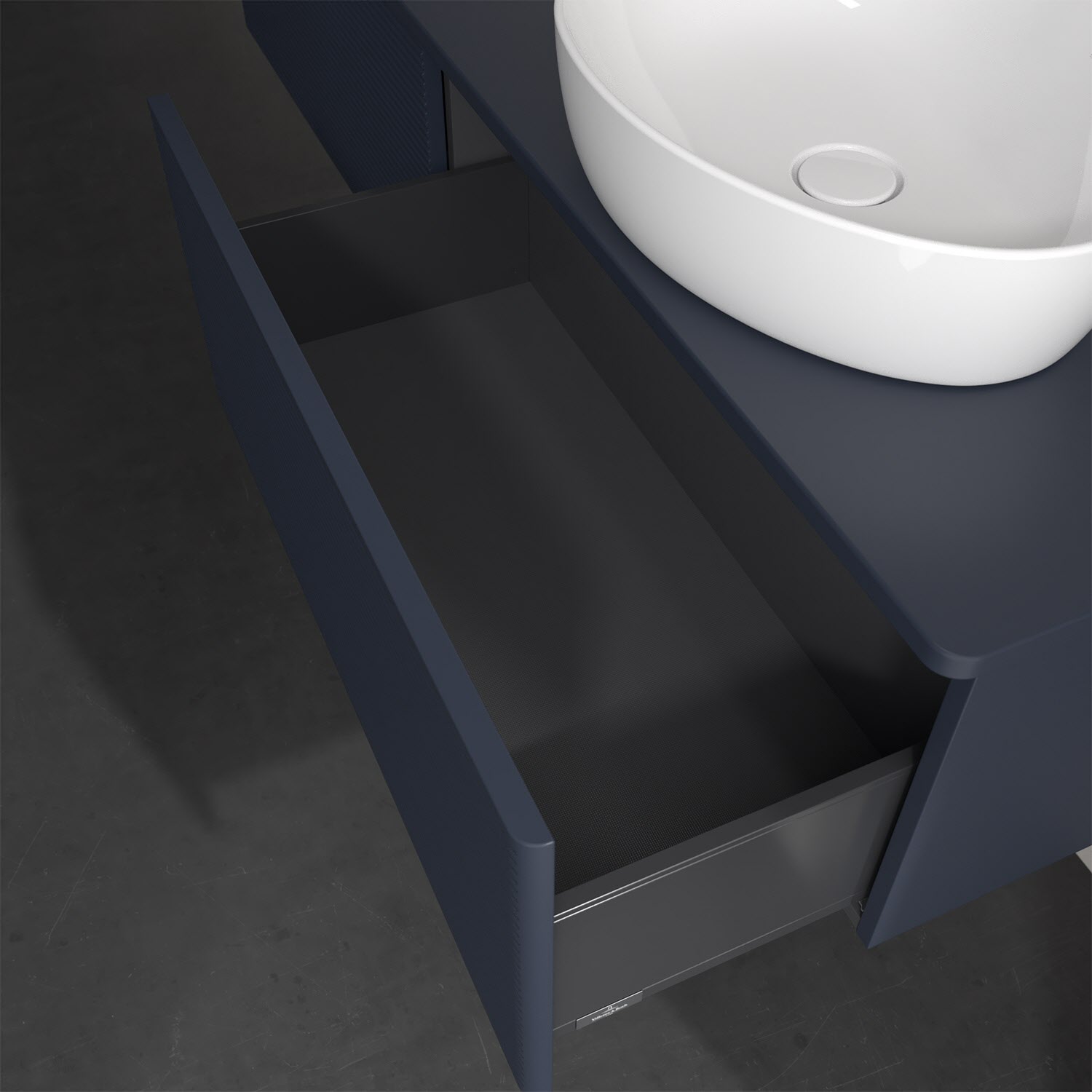 Der wandhängende Antao Waschtischunterschrank bietet mit seinen beiden extra hohen Auszügen und seiner erstaunlichen Größe viel Platz zum Verstauen von Utensilien im Badezimmer. Dank des seitlich platzierten Aufsatzwaschtischs gibt es daneben weiteren Platz für Handtücher, Seifenspender & Co. auf der Waschtischplatte. Inspiriert von der Natur überzeugt der Unterschrank auch optisch mit sanfter Formsprache und abgerundete Kanten. Die grifflosen Auszüge mit strukturierter Front sind mit der Push-to-Open Funktion ausgestattet und verfügen über einen Antirutschboden, damit Utensilien sicher verstaut werden können. Mit seiner Vollauszug- und Selbsteinzug-Funktion ist der Schrank praktisch und leicht zu bedienen. Qualität von Villeroy & Boch! Für eine besonders leichte Pflege sorgt die mehrschichtig deckend lackierte Oberfläche.