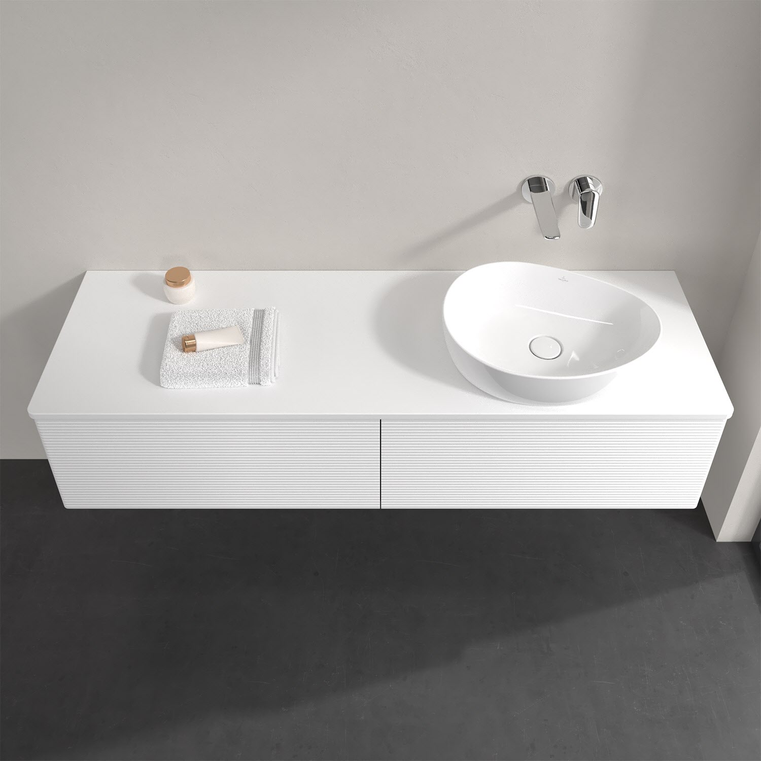 Der wandhängende Antao Waschtischunterschrank bietet mit seinen beiden extra hohen Auszügen und seiner erstaunlichen Größe viel Platz zum Verstauen von Utensilien im Badezimmer. Dank des seitlich platzierten Aufsatzwaschtischs gibt es daneben weiteren Platz für Handtücher, Seifenspender & Co. auf der Waschtischplatte. Inspiriert von der Natur überzeugt der Unterschrank auch optisch mit sanfter Formsprache und abgerundete Kanten. Die grifflosen Auszüge mit strukturierter Front sind mit der Push-to-Open Funktion ausgestattet und verfügen über einen Antirutschboden, damit Utensilien sicher verstaut werden können. Mit seiner Vollauszug- und Selbsteinzug-Funktion ist der Schrank praktisch und leicht zu bedienen. Qualität von Villeroy & Boch! Für eine besonders leichte Pflege sorgt die mehrschichtig deckend lackierte Oberfläche.