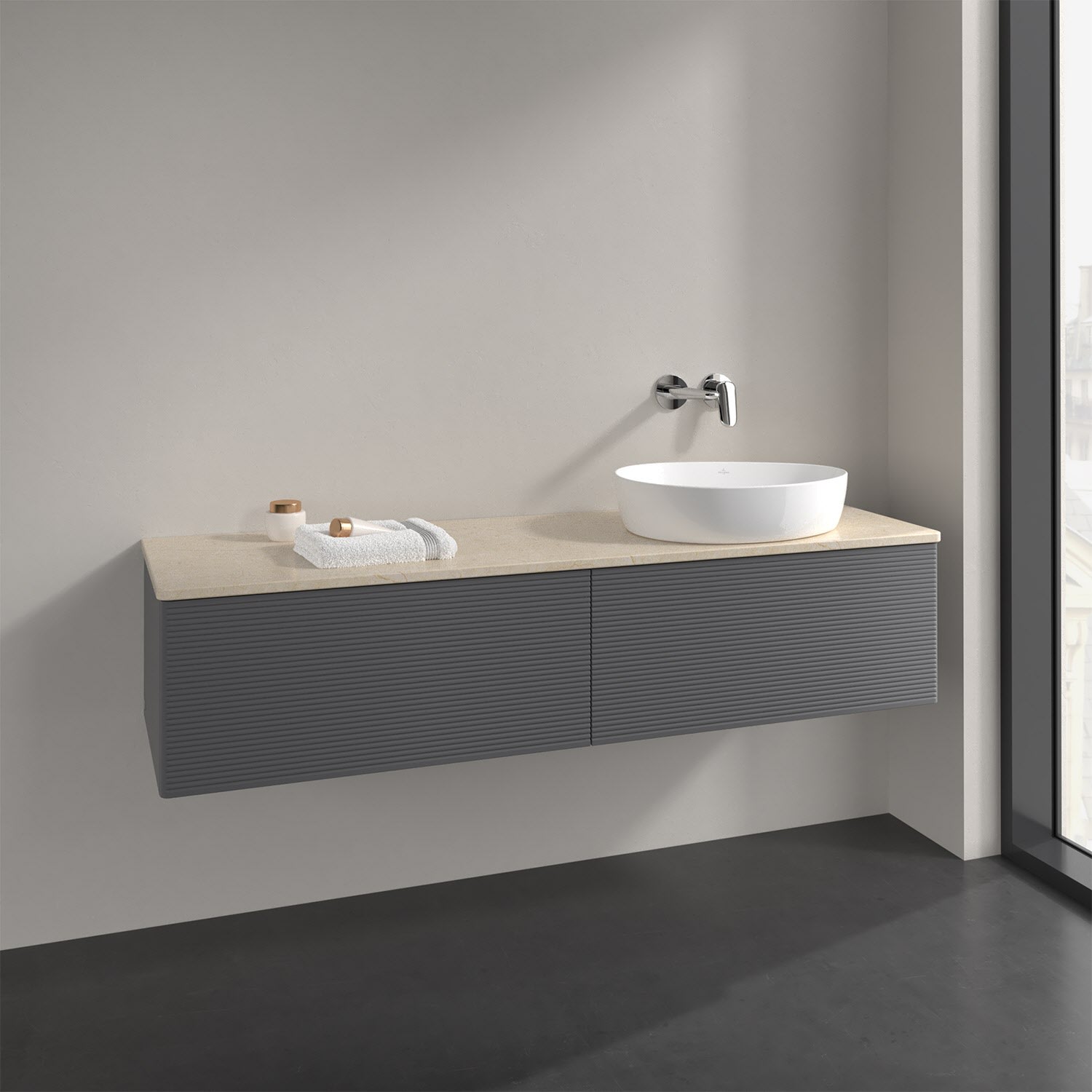 Villeroy & Boch Antao Waschbeckenunterschrank, 160 x 36 cm, 2 Auszüge, Front mit Struktur, ohne Hahnloch, für Waschtisch rechts