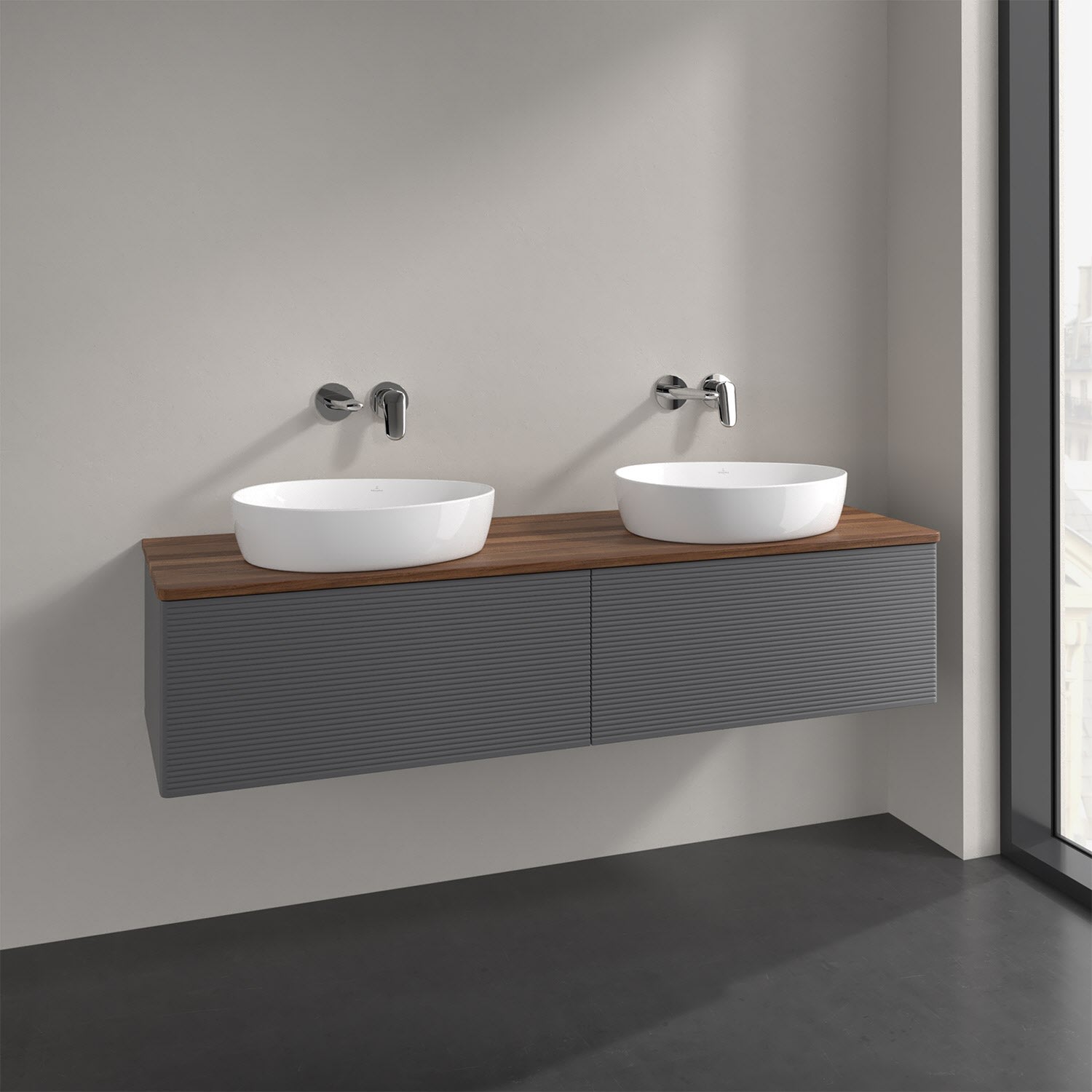 Der wandhängende Antao Waschtischunterschrank für zwei Aufsatzwaschtische bietet mit seinen beiden extra hohen Auszügen und seiner erstaunlichen Größe viel Platz zum Verstauen von Utensilien im Badezimmer. Inspiriert von der Natur überzeugt der Unterschrank auch optisch mit sanfter Formsprache und abgerundete Kanten. Die grifflosen Auszüge mit strukturierter Front sind mit der Push-to-Open Funktion ausgestattet und verfügen über einen Antirutschboden, damit Utensilien sicher verstaut werden können. Mit seiner Vollauszug- und Selbsteinzug-Funktion ist der Schrank praktisch und leicht zu bedienen. Qualität von Villeroy & Boch! Für eine besonders leichte Pflege sorgt die mehrschichtig deckend lackierte Oberfläche. Bei der Ausführung in Massivholz wird dank des verarbeiteten Massivholzes jedes Möbel zu einem Unikat, das sich durch das lebendige Naturmaterial durch seine einzigartige Struktur und Maserung auszeichnet.
