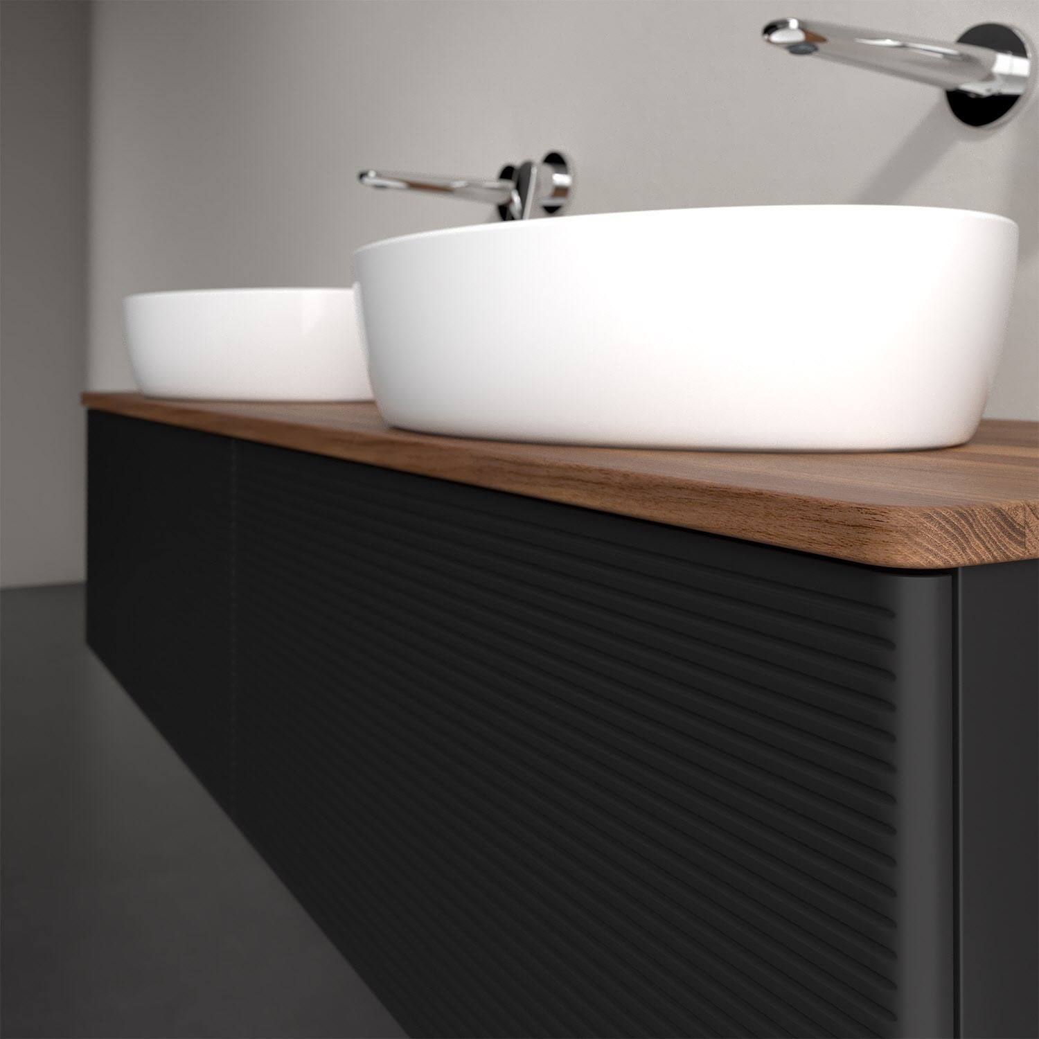 Der wandhängende Antao Waschtischunterschrank für zwei Aufsatzwaschtische bietet mit seinen beiden extra hohen Auszügen und seiner erstaunlichen Größe viel Platz zum Verstauen von Utensilien im Badezimmer. Inspiriert von der Natur überzeugt der Unterschrank auch optisch mit sanfter Formsprache und abgerundete Kanten. Die grifflosen Auszüge mit strukturierter Front sind mit der Push-to-Open Funktion ausgestattet und verfügen über einen Antirutschboden, damit Utensilien sicher verstaut werden können. Mit seiner Vollauszug- und Selbsteinzug-Funktion ist der Schrank praktisch und leicht zu bedienen. Qualität von Villeroy & Boch! Für eine besonders leichte Pflege sorgt die mehrschichtig deckend lackierte Oberfläche. Bei der Ausführung in Massivholz wird dank des verarbeiteten Massivholzes jedes Möbel zu einem Unikat, das sich durch das lebendige Naturmaterial durch seine einzigartige Struktur und Maserung auszeichnet.