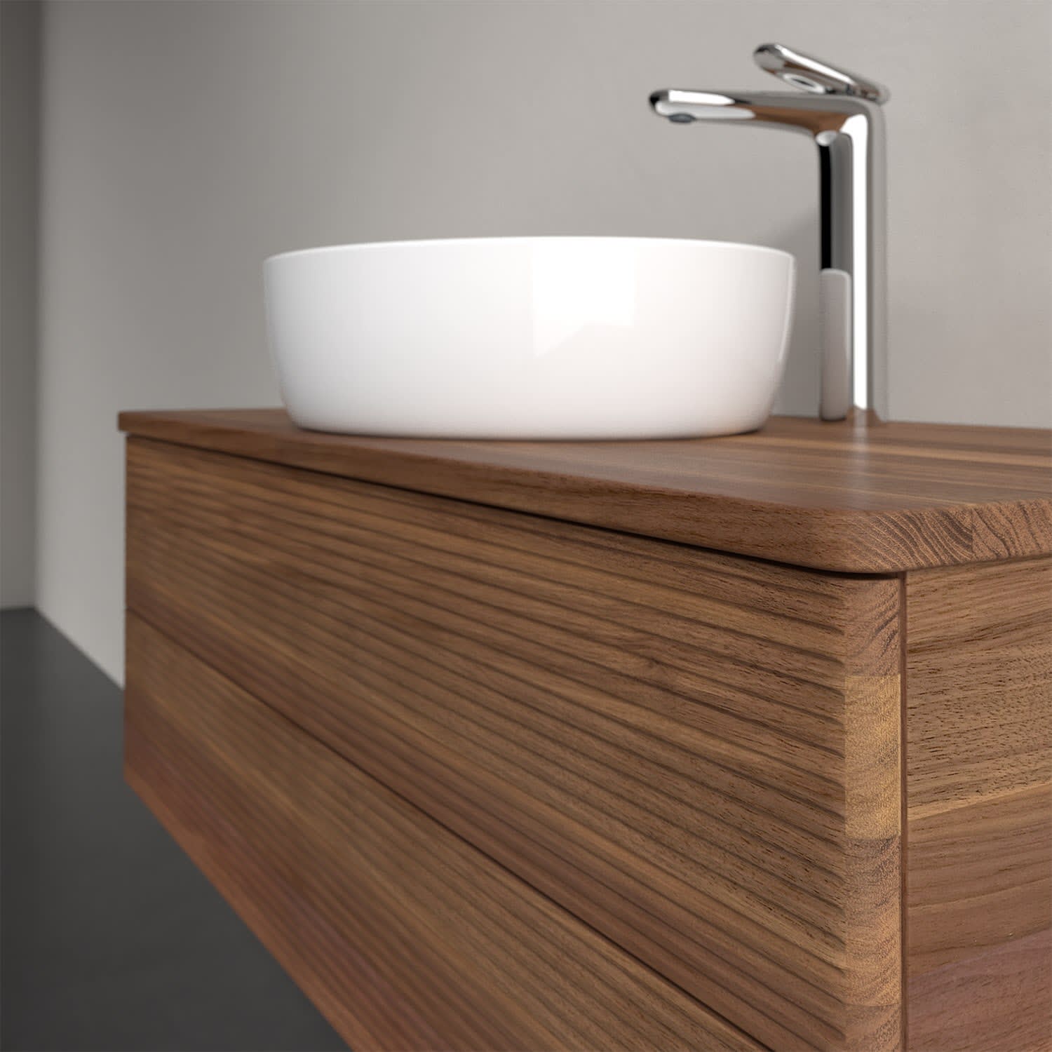 Mit dem wandhängenden Antao Waschtischunterschrank entscheidet man sich für eine hochwertige und praktische Stauraumlösung, die viel Freude bereitet. Die Funktionen sind besonders gut durchdacht: Im Inneren der beiden vollausziehbaren Auszüge können Handtücher, Kosmetik oder andere Pflegeprodukte dank des Antirutschbodens bequem aufbewahrt werden. Geöffnet wird das Möbel durch leichten Druck auf die strukturierte Front. Natürlich verfügen die Auszüge über eingebaute Dämpfer, die sie anschließend wieder sanft und leise schließen lassen. Auch auf der Waschtischplatte finden die wichtigsten Utensilien seitlich des Waschtischs genügend Platz. Optisch sorgt der Unterschrank von Villeroy & Boch mit seinen abgerundeten Kanten für ein modernes, gemütliches Ambiente. Für eine besonders leichte Pflege sorgt die mehrschichtig deckend lackierte Oberfläche. Bei der Ausführung in Massivholz wird dank des verarbeiteten Massivholzes jedes Möbel zu einem Unikat, das sich durch das lebendige Naturmaterial durch seine einzigartige Struktur und Maserung auszeichnet.