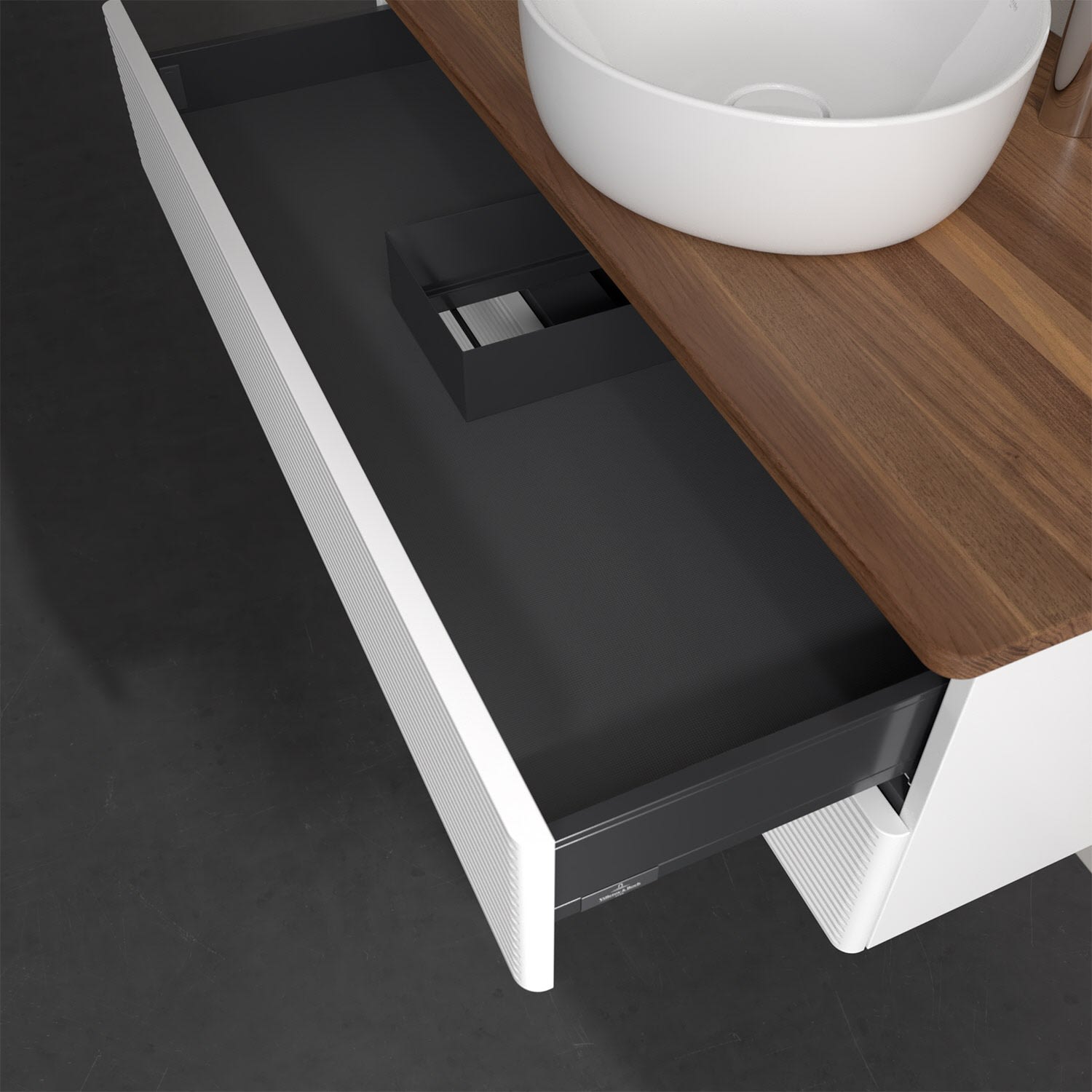 - kein Umfallen oder Verrutschen von Pflegeprodukten in den Schubladen dank rutschhemmendem Boden