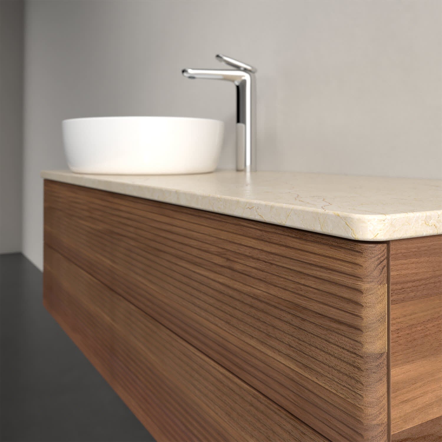 Der wandhängende Antao Waschtischunterschrank von Villeroy & Boch bietet nicht nur jede Menge Stauraum – er ist dank seines naturinspirierten Designs mit seinen abgerundeten Kanten auch noch besonders stilvoll und schafft eine gemütliche Atmosphäre im Badezimmer. Auf der Waschtischplatte bietet sich seitlich des Waschtischs viel Platz für Zahnbürstenbecher oder Seifenspender. Zwei geräumige Auszüge bieten viel Platz, um alles Notwendige zu verstauen und Ordnung zu halten. Öffnen lassen sie sich durch leichten Druck auf die strukturierte Front. Dank Vollauszug hat man immer alles im Blick und der Antirutschboden verhindert ein Umfallen oder Verrutschen der Gegenstände. Einfach clever! Für eine besonders leichte Pflege sorgt die mehrschichtig deckend lackierte Oberfläche. Bei der Ausführung in Massivholz wird dank des verarbeiteten Massivholzes jedes Möbel zu einem Unikat, das sich durch das lebendige Naturmaterial durch seine einzigartige Struktur und Maserung auszeichnet.