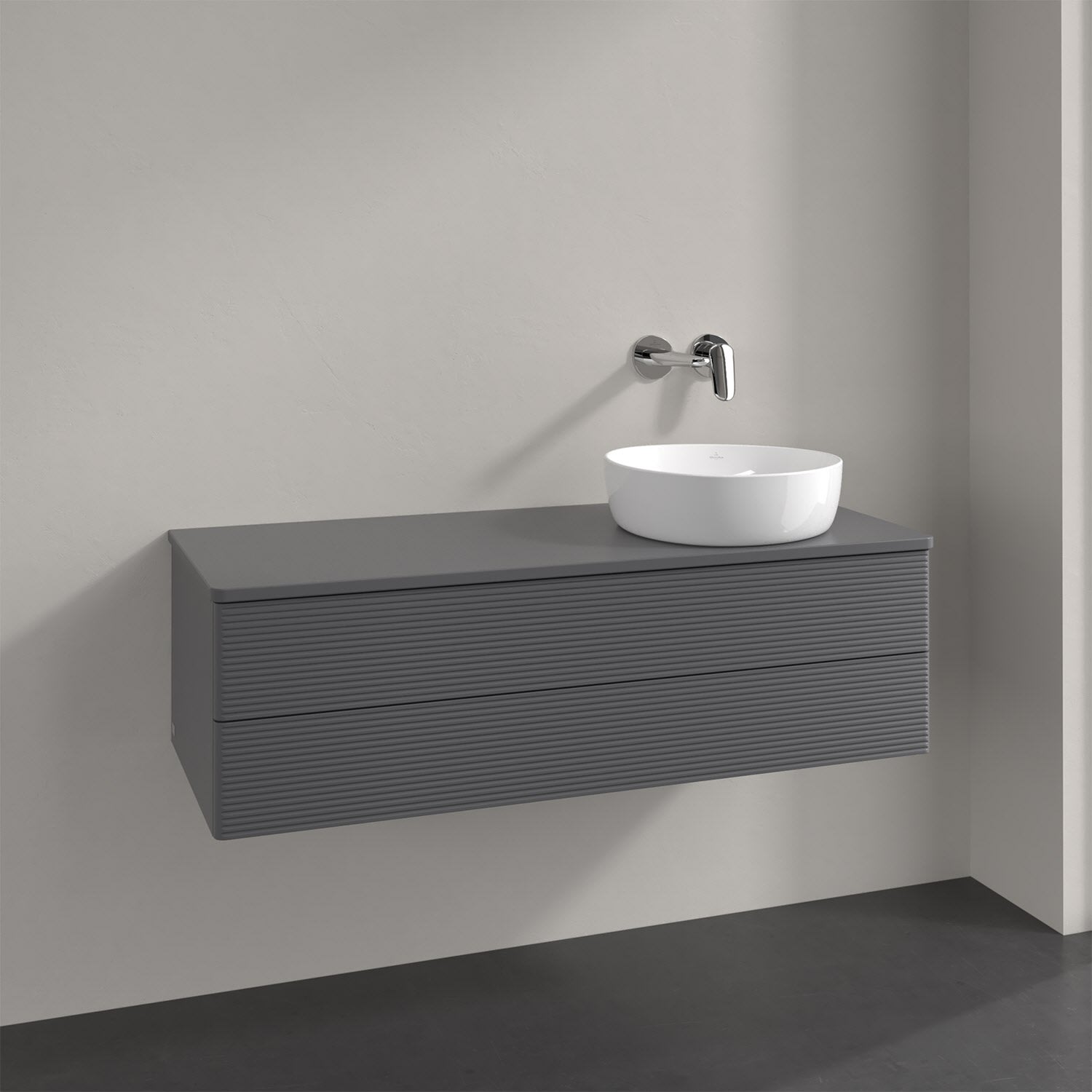 Villeroy & Boch Antao Waschbeckenunterschrank, 120 x 19 cm, 2 Auszüge, Fronten mit Struktur, mit Hahnloch, für Waschtisch rechts