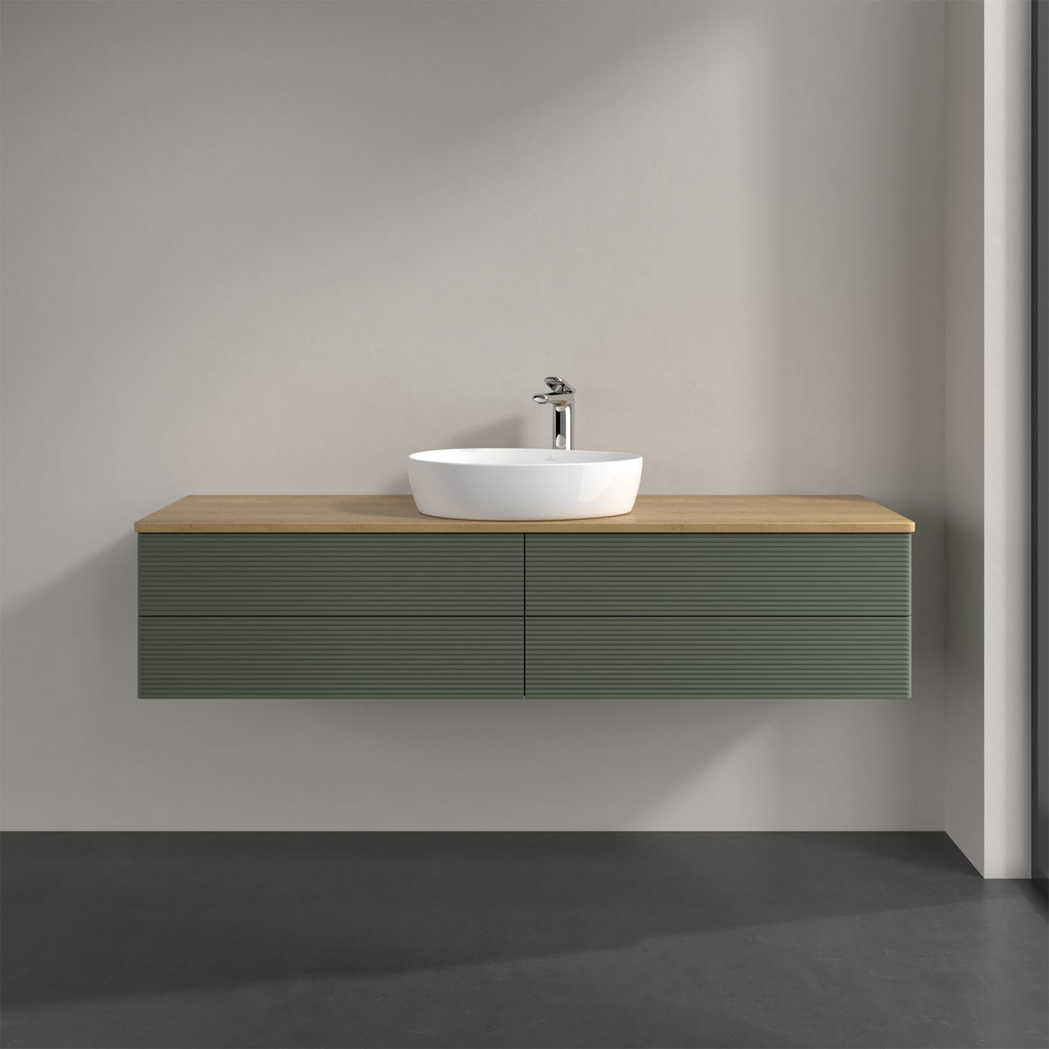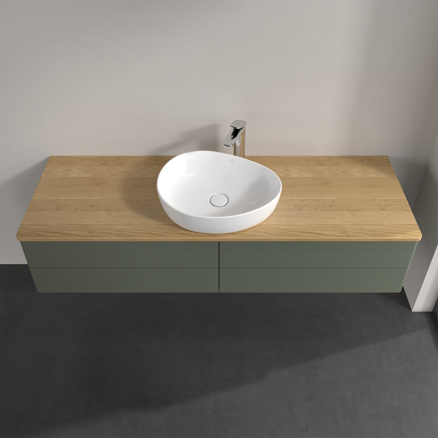 Der wandhängende Antao Waschtischunterschrank bietet mit seinen vier Auszügen und seiner erstaunlichen Größe viel Platz zum Verstauen von Utensilien im Badezimmer. Dank des mittig platzierten Aufsatzwaschtischs gibt es seitlich weiteren Platz für Handtücher, Seifenspender & Co. auf der Waschtischplatte. Inspiriert von der Natur überzeugt der Unterschrank auch optisch mit sanfter Formsprache und abgerundete Kanten. Die grifflosen Auszüge mit strukturierter Front sind mit der Push-to-Open Funktion ausgestattet und verfügen über einen Antirutschboden, damit Utensilien sicher verstaut werden können. Mit seiner Vollauszug- und Selbsteinzug-Funktion ist der Schrank praktisch und leicht zu bedienen. Qualität von Villeroy & Boch! Für eine besonders leichte Pflege sorgt die mehrschichtig deckend lackierte Oberfläche. Bei der Ausführung in Massivholz wird dank des verarbeiteten Massivholzes jedes Möbel zu einem Unikat, das sich durch das lebendige Naturmaterial durch seine einzigartige Struktur und Maserung auszeichnet.