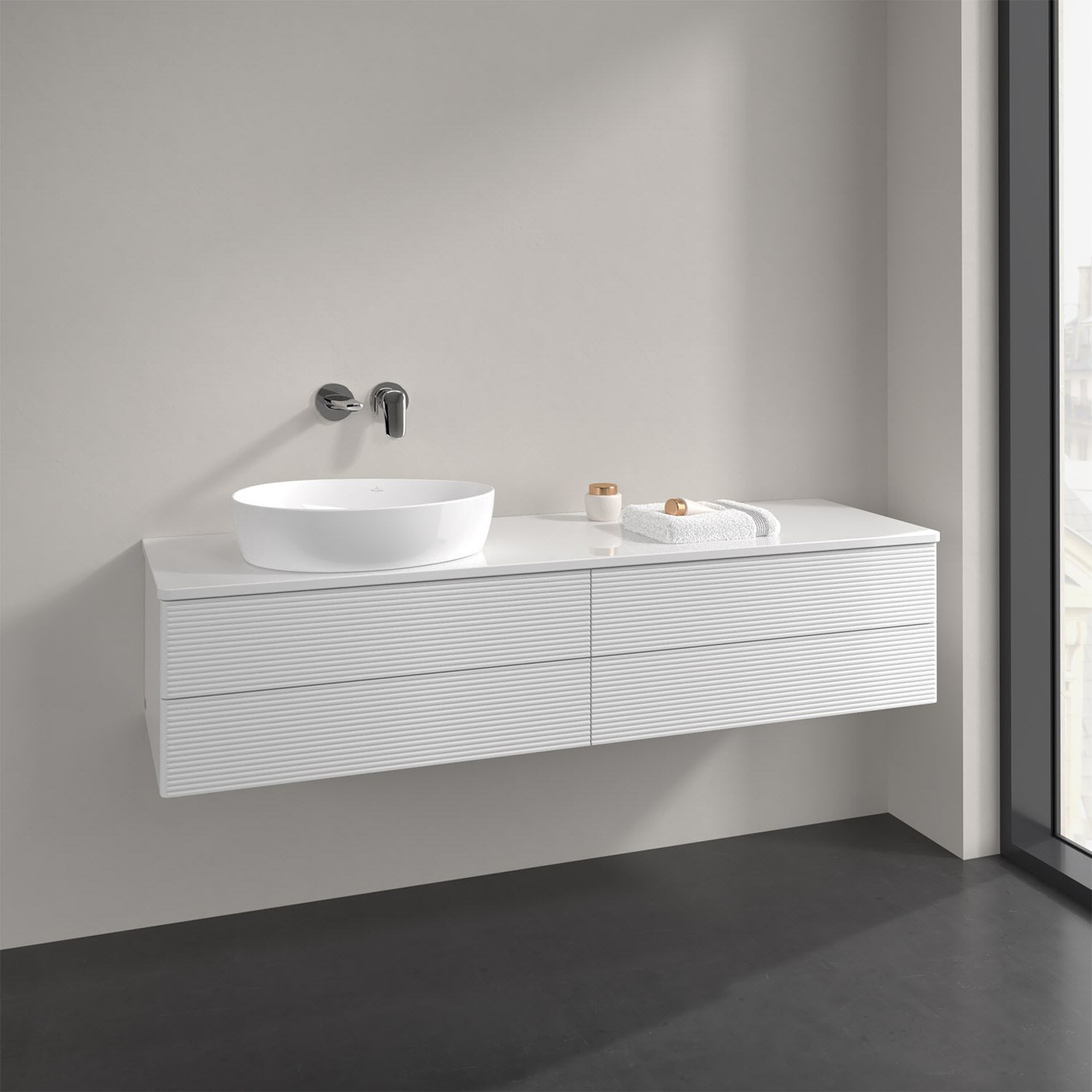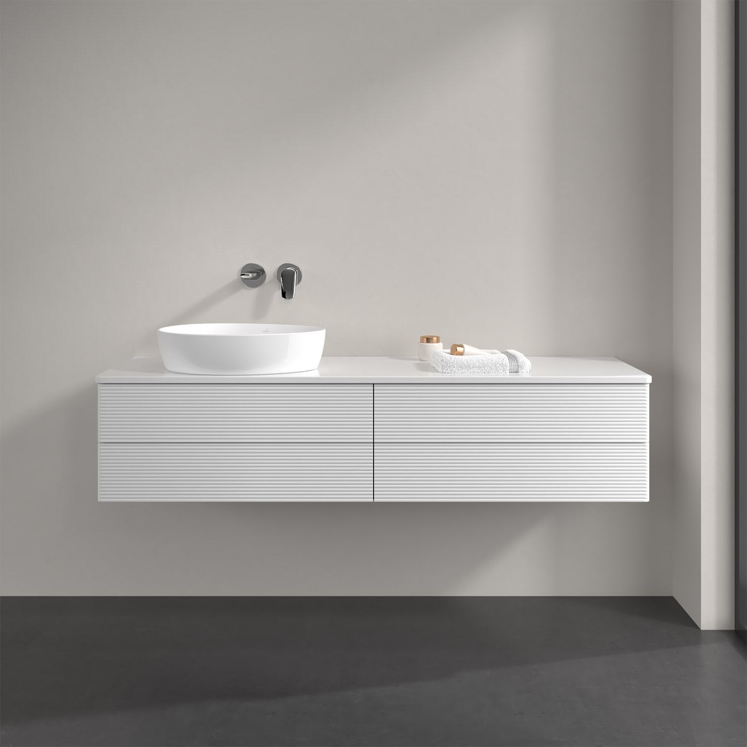Villeroy & Boch Antao Waschbeckenunterschrank, 160 x 19 cm, 4 Auszüge, Fronten mit Struktur, mit Hahnloch, für Waschtisch links