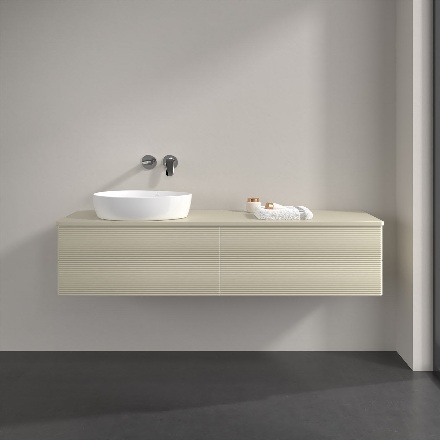 Villeroy & Boch Antao Waschbeckenunterschrank, 160 x 19 cm, 4 Auszüge, Fronten mit Struktur, mit Hahnloch, für Waschtisch links
