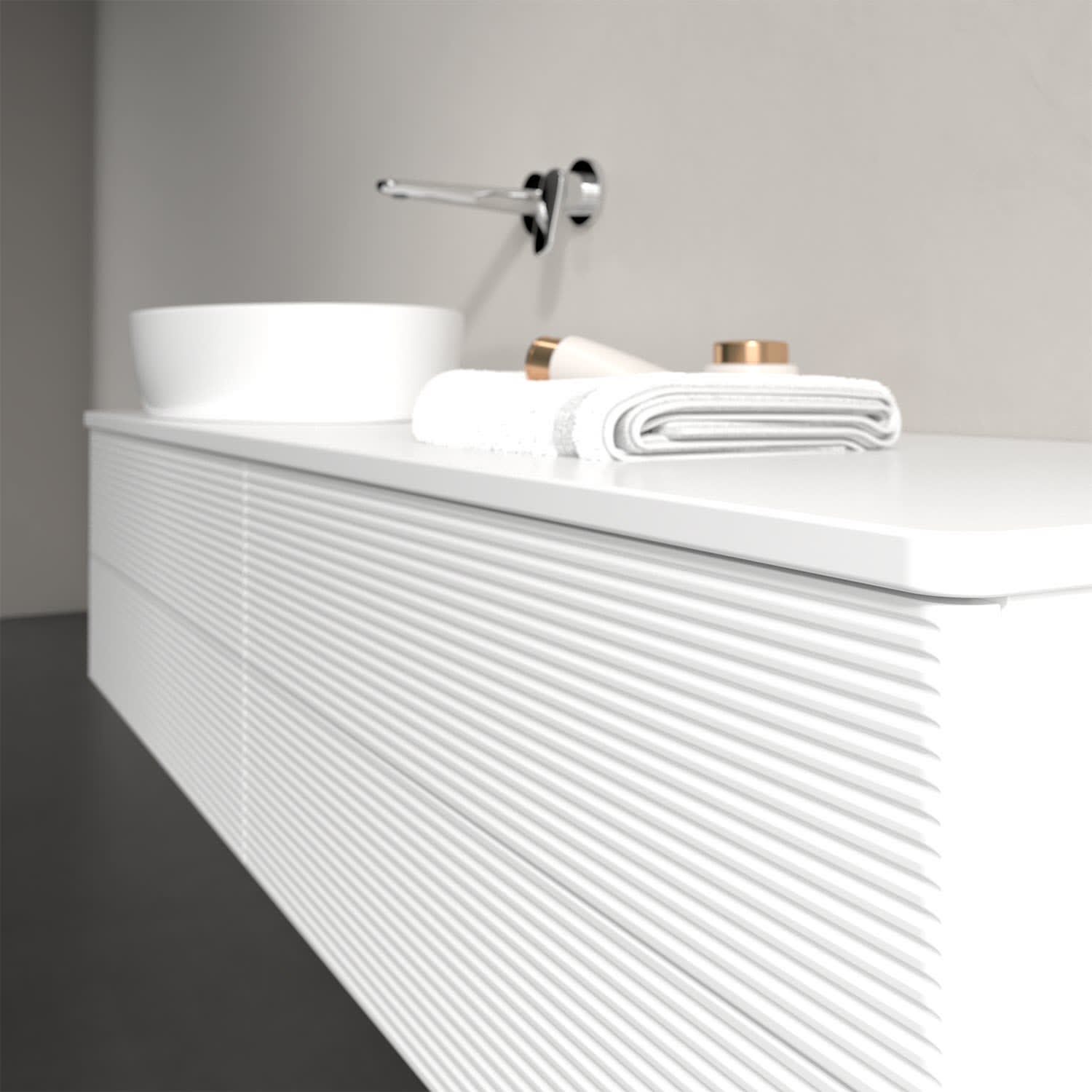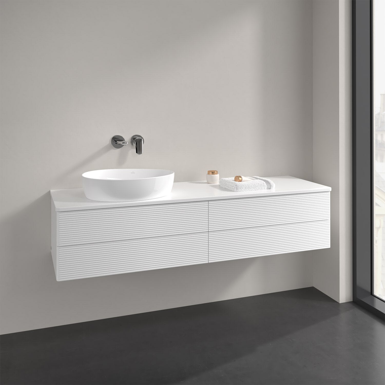 Der wandhängende Antao Waschtischunterschrank bietet mit seinen vier Auszügen und seiner erstaunlichen Größe viel Platz zum Verstauen von Utensilien im Badezimmer. Dank des seitlich platzierten Aufsatzwaschtischs gibt es daneben weiteren Platz für Handtücher, Seifenspender & Co. auf der Waschtischplatte. Inspiriert von der Natur überzeugt der Unterschrank auch optisch mit sanfter Formsprache und abgerundete Kanten. Die grifflosen Auszüge mit strukturierter Front sind mit der Push-to-Open Funktion ausgestattet und verfügen über einen Antirutschboden, damit Utensilien sicher verstaut werden können. Mit seiner Vollauszug- und Selbsteinzug-Funktion ist der Schrank praktisch und leicht zu bedienen. Qualität von Villeroy & Boch! Für eine besonders leichte Pflege sorgt die mehrschichtig deckend lackierte Oberfläche.