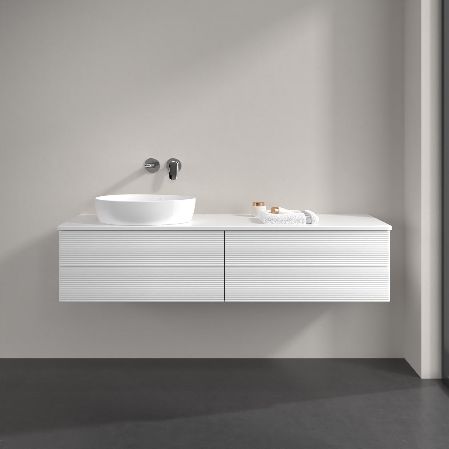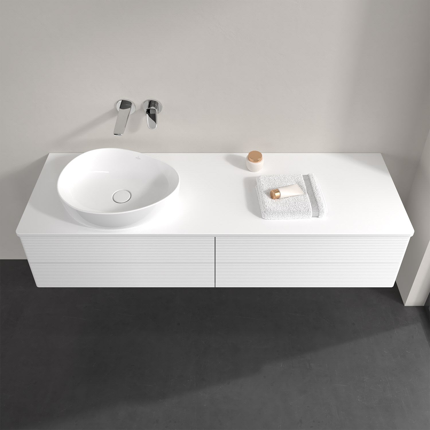 Villeroy & Boch Antao Waschbeckenunterschrank, 160 x 19 cm, 4 Auszüge, Fronten mit Struktur, mit Hahnloch, für Waschtisch links