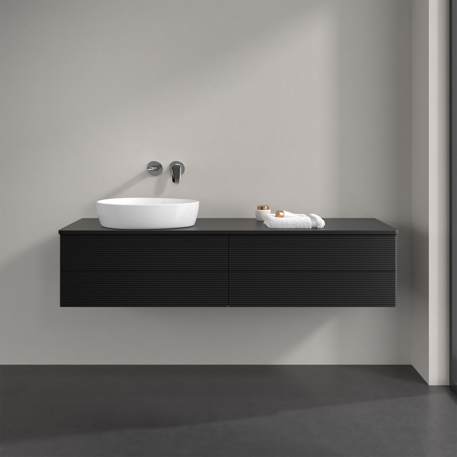 Villeroy & Boch Antao Waschbeckenunterschrank, 160 x 19 cm, 4 Auszüge, Fronten mit Struktur, mit Hahnloch, für Waschtisch links