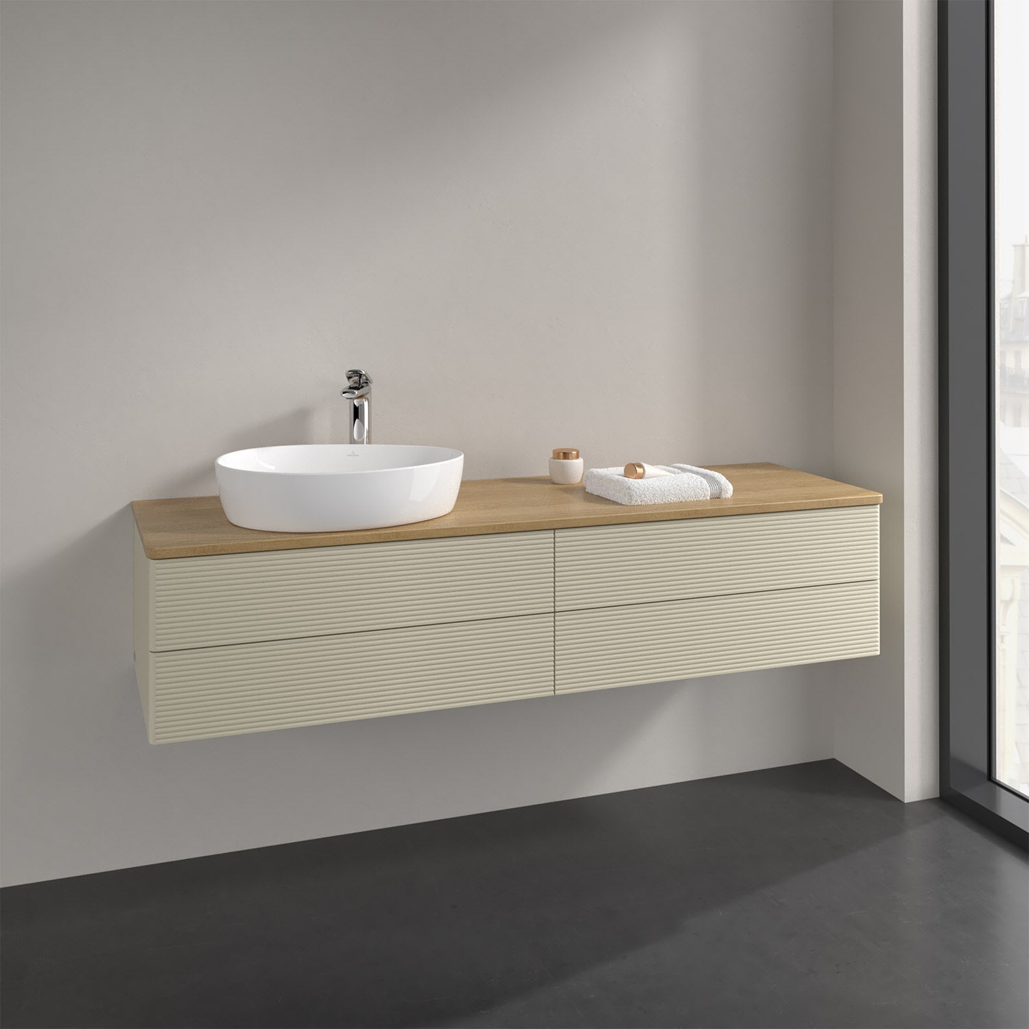 Der wandhängende Antao Waschtischunterschrank bietet mit seinen vier Auszügen und seiner erstaunlichen Größe viel Platz zum Verstauen von Utensilien im Badezimmer. Dank des seitlich platzierten Aufsatzwaschtischs gibt es daneben weiteren Platz für Handtücher, Seifenspender & Co. auf der Waschtischplatte. Inspiriert von der Natur überzeugt der Unterschrank auch optisch mit sanfter Formsprache und abgerundete Kanten. Die grifflosen Auszüge mit strukturierter Front sind mit der Push-to-Open Funktion ausgestattet und verfügen über einen Antirutschboden, damit Utensilien sicher verstaut werden können. Mit seiner Vollauszug- und Selbsteinzug-Funktion ist der Schrank praktisch und leicht zu bedienen. Qualität von Villeroy & Boch! Für eine besonders leichte Pflege sorgt die mehrschichtig deckend lackierte Oberfläche. Bei der Ausführung in Massivholz wird dank des verarbeiteten Massivholzes jedes Möbel zu einem Unikat, das sich durch das lebendige Naturmaterial durch seine einzigartige Struktur und Maserung auszeichnet.