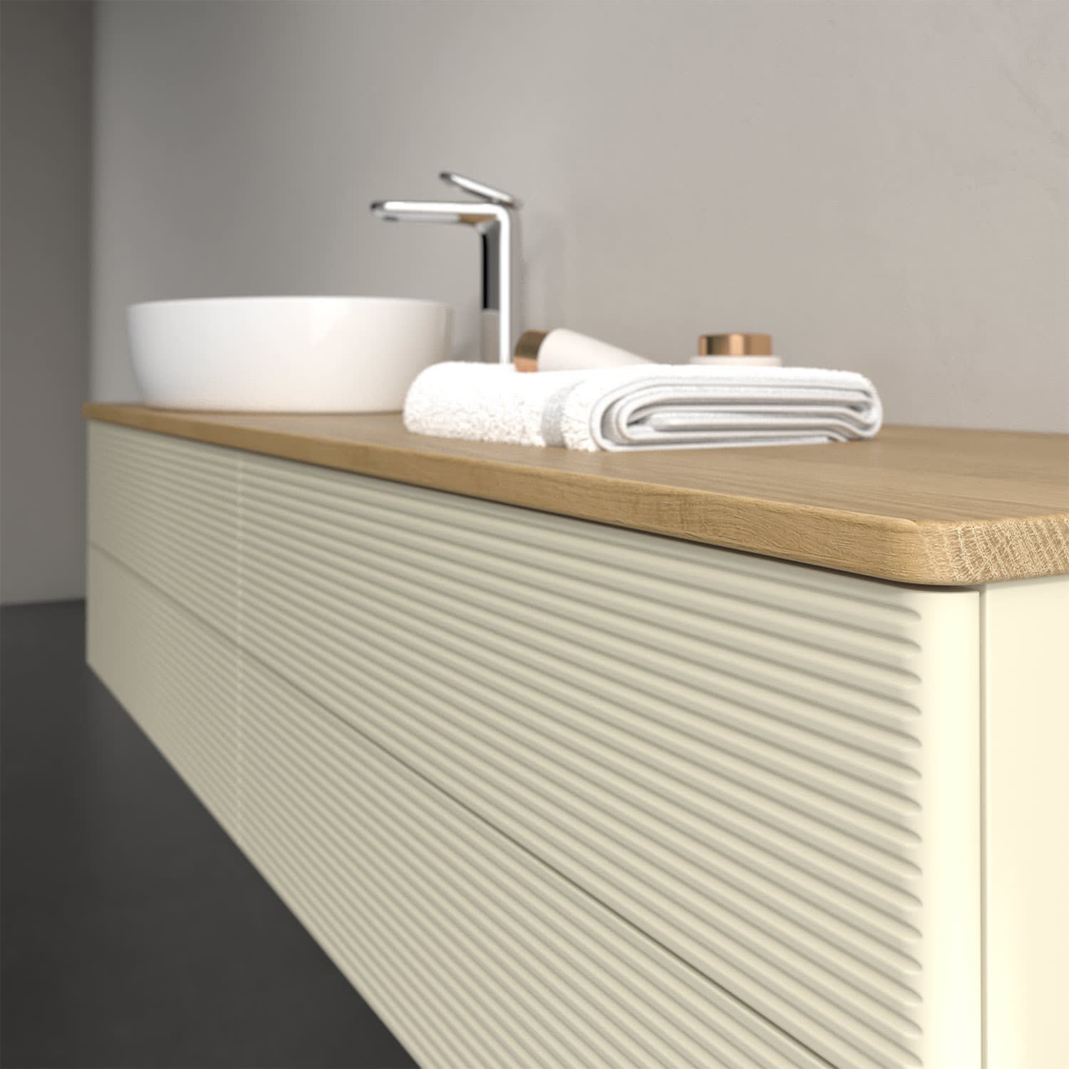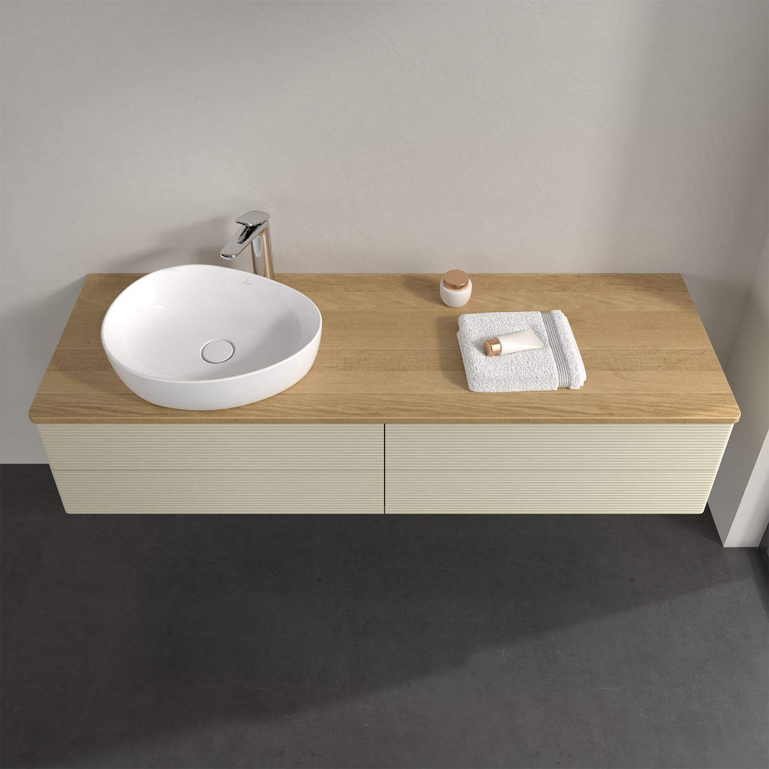Für diesen Waschbeckenunterschrank stehen Ihnen Aufsatzwaschtische aus verschiedenen Serien zur Verfügung (siehe "Passliste" unter Downloads). Ein ausgewähltes Beispiel finden Sie im Zubehör. Den Waschtisch bitte separat mitbestellen.