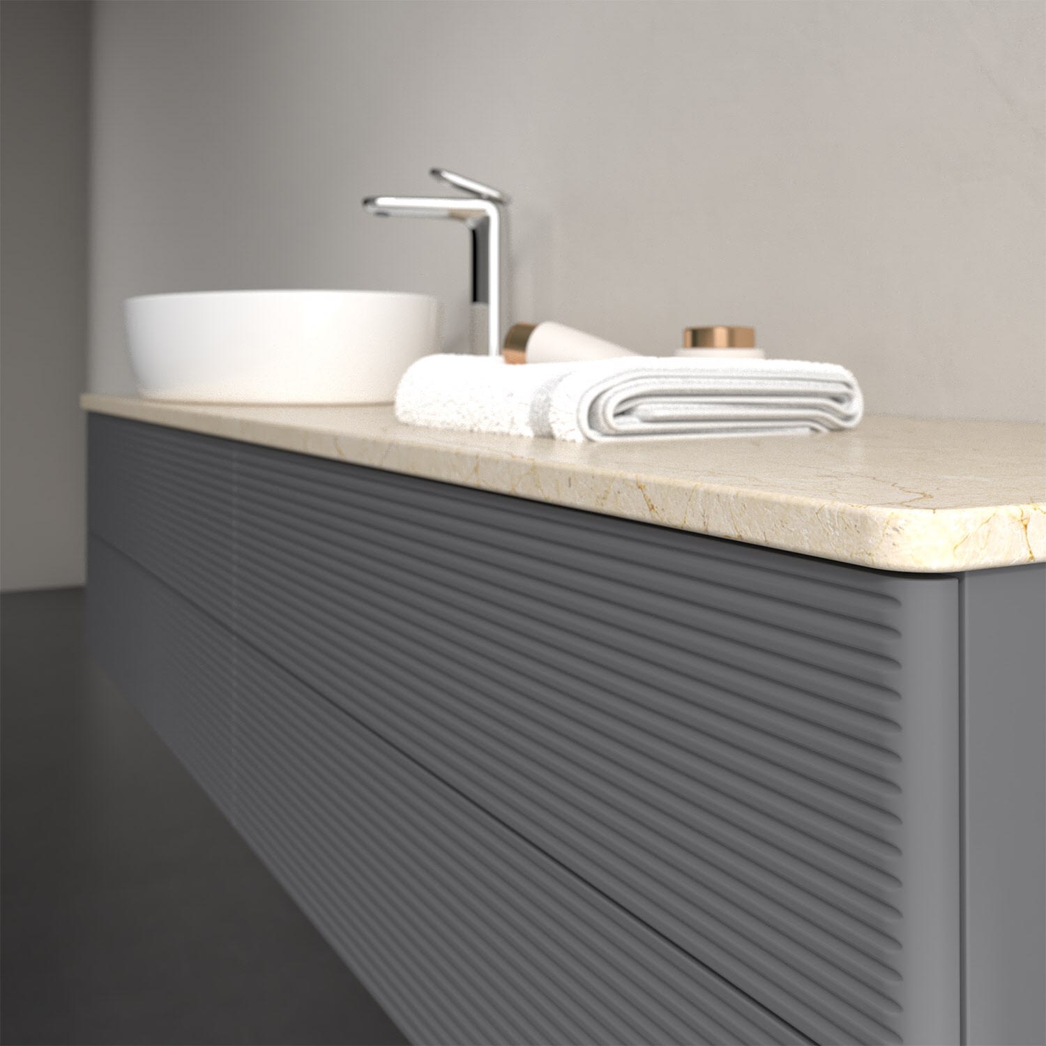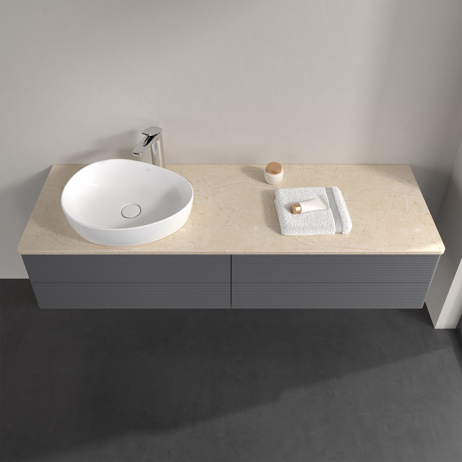 Für diesen Waschbeckenunterschrank stehen Ihnen Aufsatzwaschtische aus verschiedenen Serien zur Verfügung (siehe "Passliste" unter Downloads). Ein ausgewähltes Beispiel finden Sie im Zubehör. Den Waschtisch bitte separat mitbestellen.