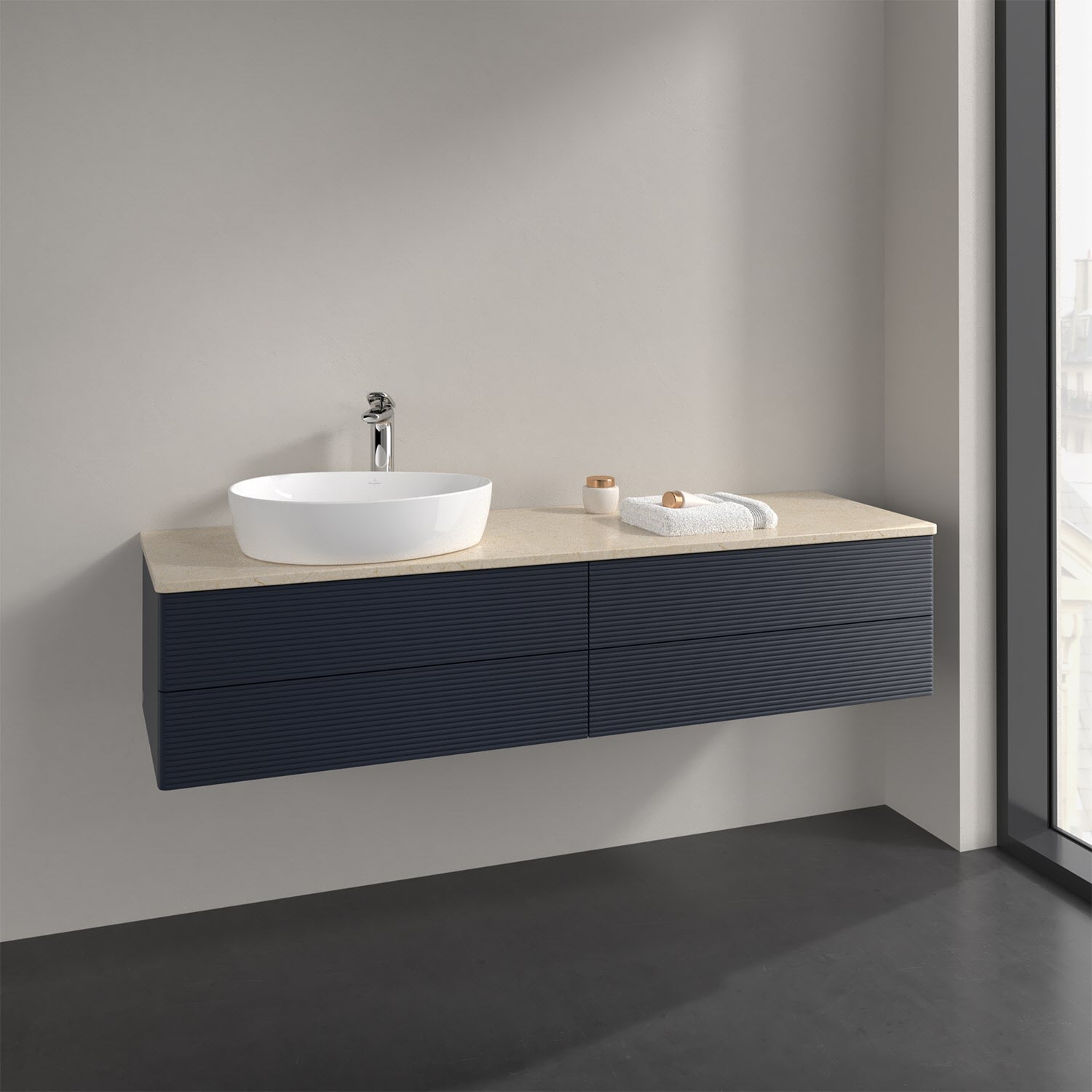 Villeroy & Boch Antao Waschbeckenunterschrank, 160 x 19 cm, 4 Auszüge, Fronten mit Struktur, mit Hahnloch, für Waschtisch links