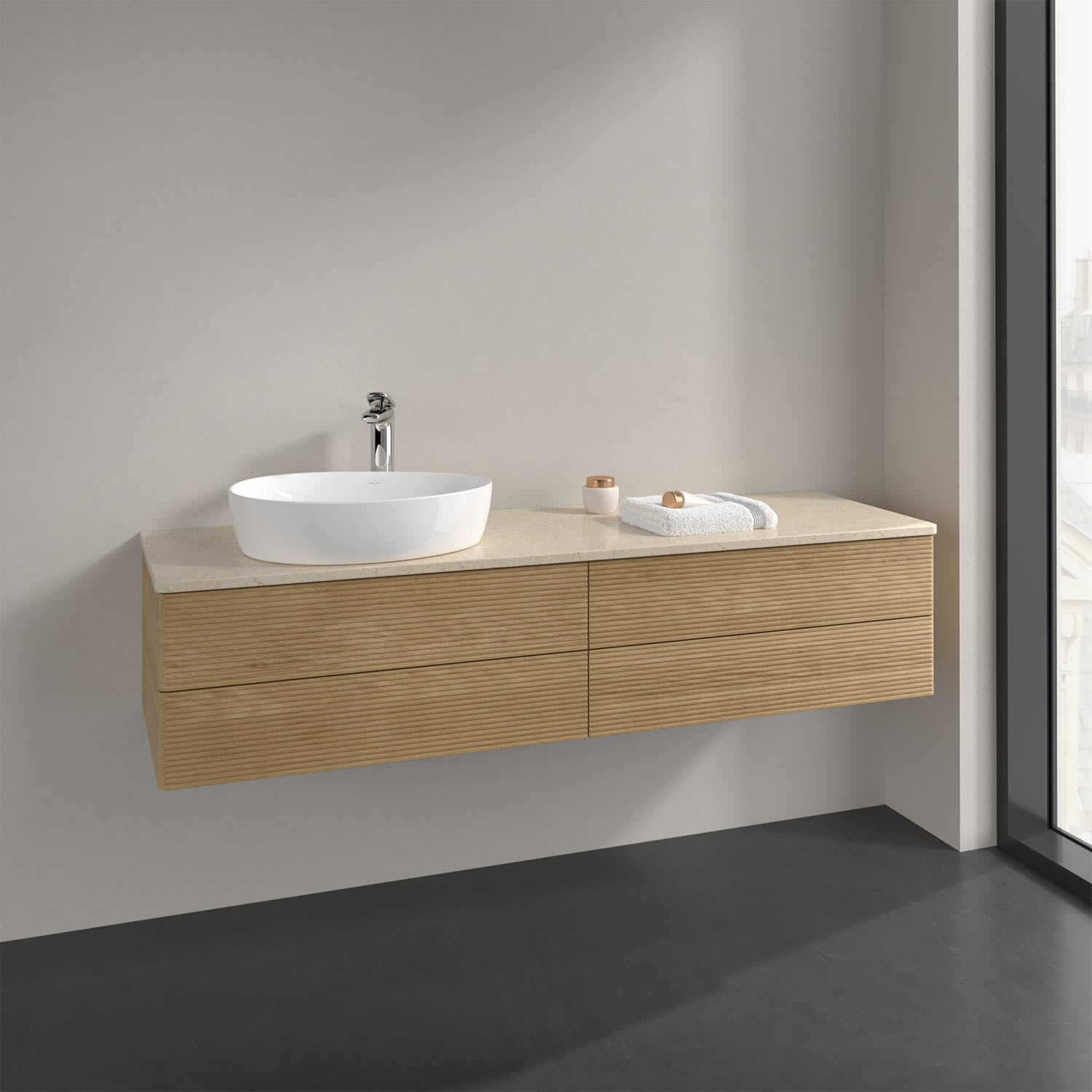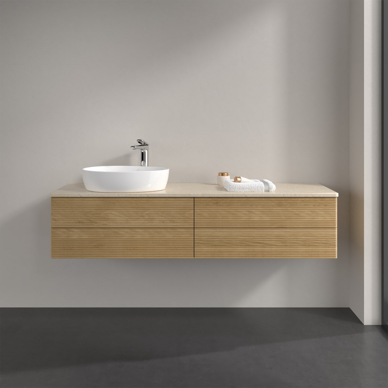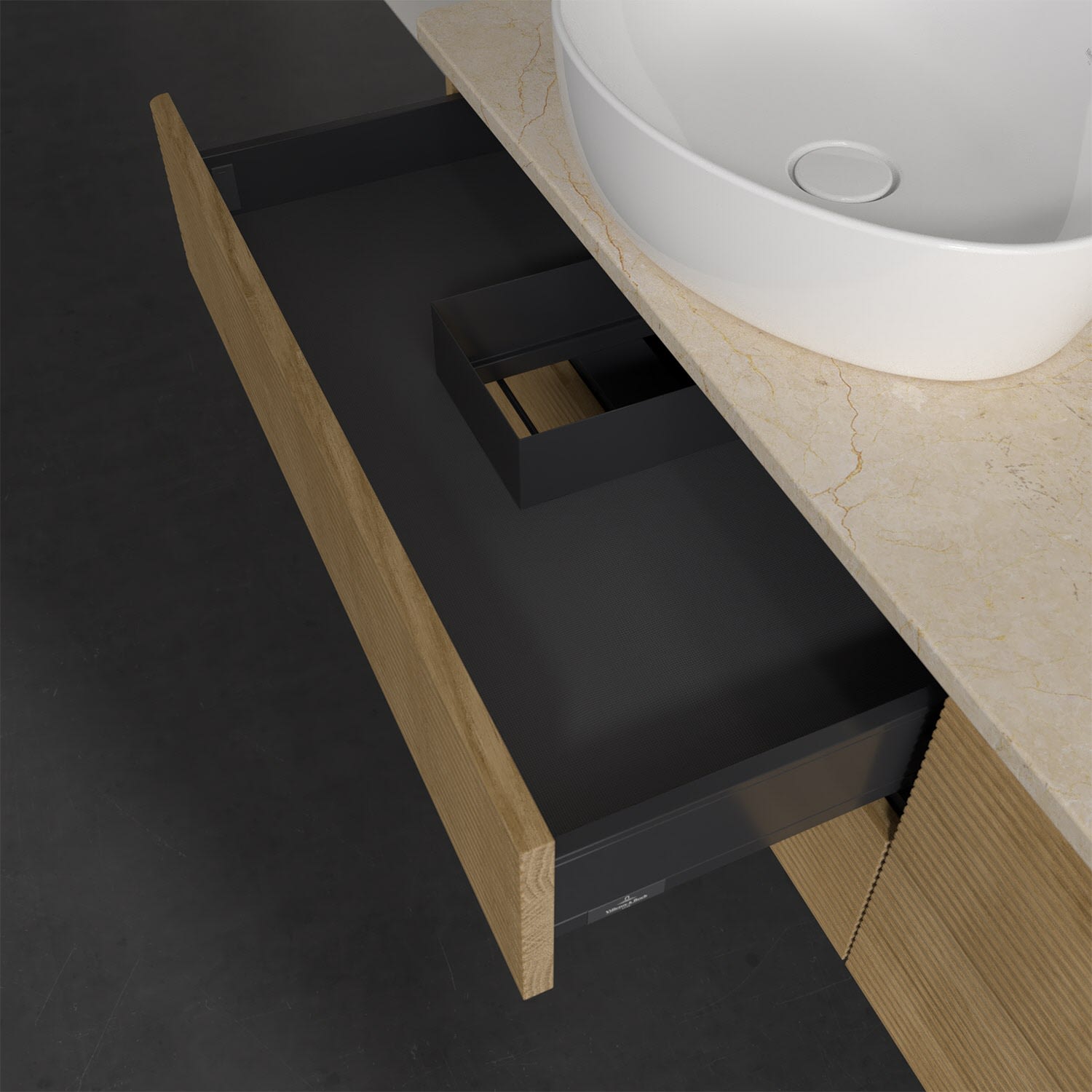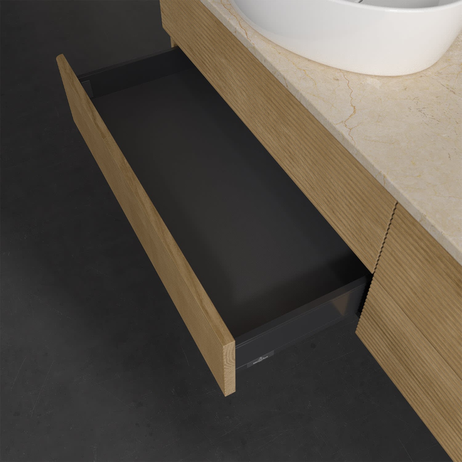 Villeroy & Boch Antao Waschbeckenunterschrank, 160 x 19 cm, 4 Auszüge, Fronten mit Struktur, mit Hahnloch, für Waschtisch links
