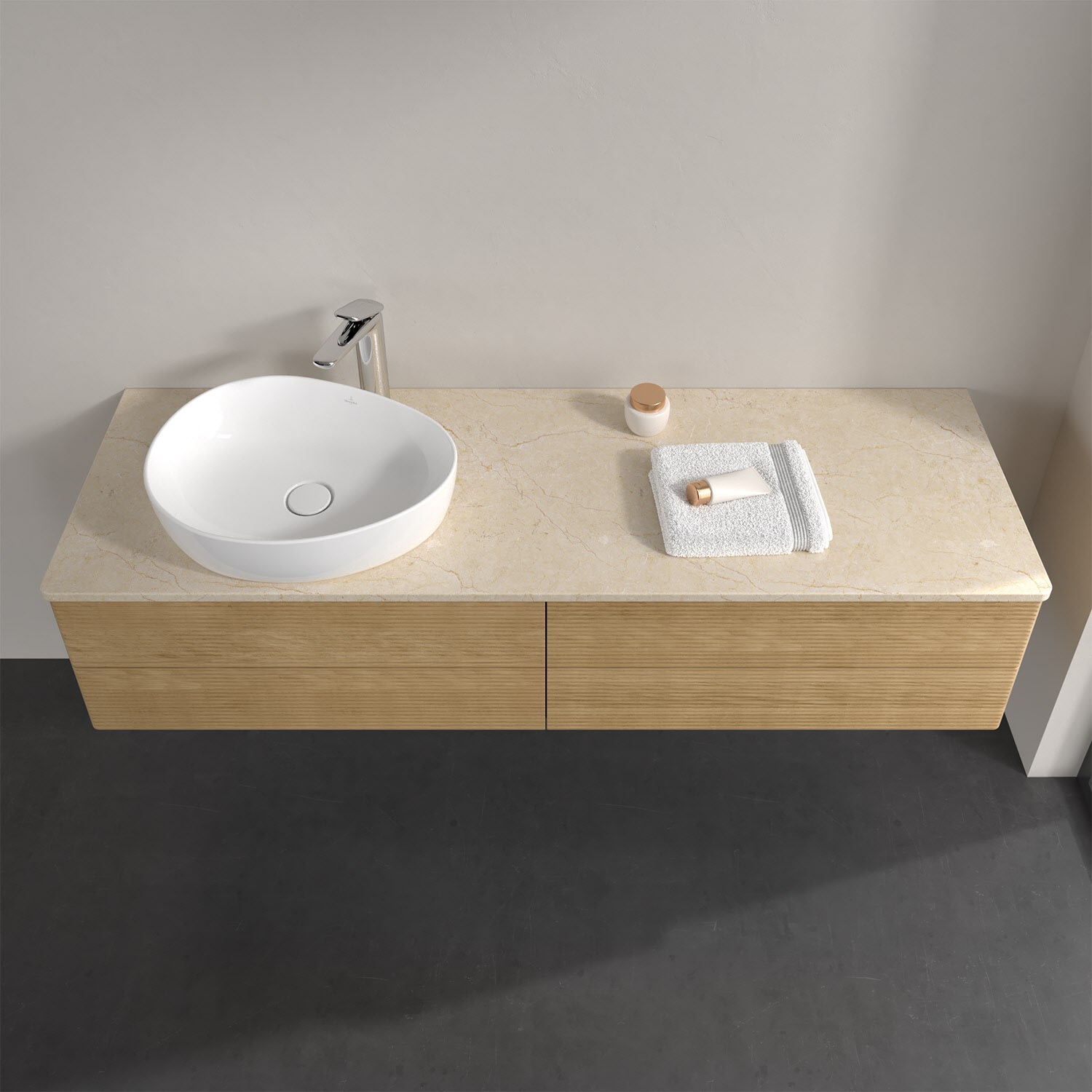 Für diesen Waschbeckenunterschrank stehen Ihnen Aufsatzwaschtische aus verschiedenen Serien zur Verfügung (siehe "Passliste" unter Downloads). Ein ausgewähltes Beispiel finden Sie im Zubehör. Den Waschtisch bitte separat mitbestellen.