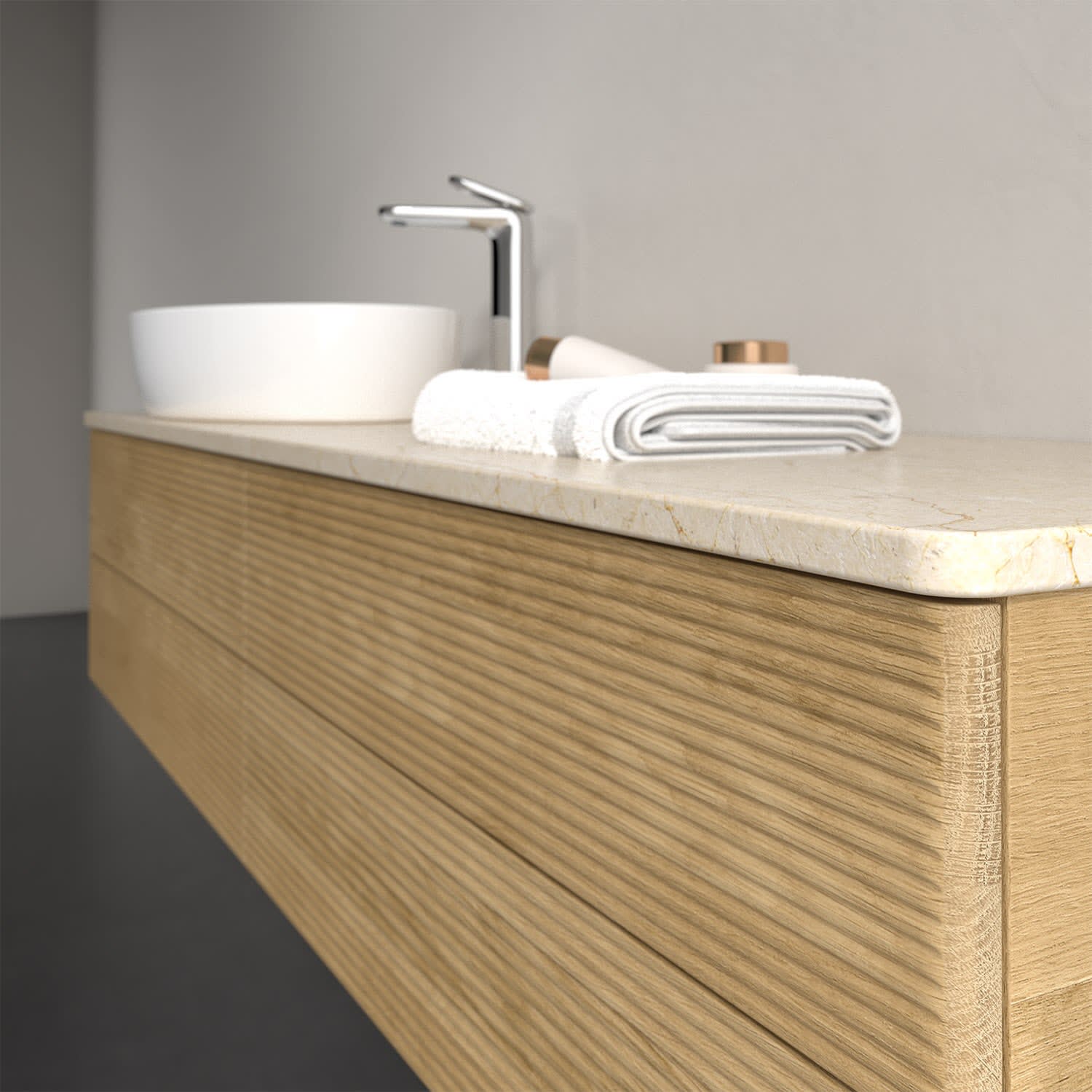 Der wandhängende Antao Waschtischunterschrank bietet mit seinen vier Auszügen und seiner erstaunlichen Größe viel Platz zum Verstauen von Utensilien im Badezimmer. Dank des seitlich platzierten Aufsatzwaschtischs gibt es daneben weiteren Platz für Handtücher, Seifenspender & Co. auf der Waschtischplatte. Inspiriert von der Natur überzeugt der Unterschrank auch optisch mit sanfter Formsprache und abgerundete Kanten. Die grifflosen Auszüge mit strukturierter Front sind mit der Push-to-Open Funktion ausgestattet und verfügen über einen Antirutschboden, damit Utensilien sicher verstaut werden können. Mit seiner Vollauszug- und Selbsteinzug-Funktion ist der Schrank praktisch und leicht zu bedienen. Qualität von Villeroy & Boch! Für eine besonders leichte Pflege sorgt die mehrschichtig deckend lackierte Oberfläche. Bei der Ausführung in Massivholz wird dank des verarbeiteten Massivholzes jedes Möbel zu einem Unikat, das sich durch das lebendige Naturmaterial durch seine einzigartige Struktur und Maserung auszeichnet.