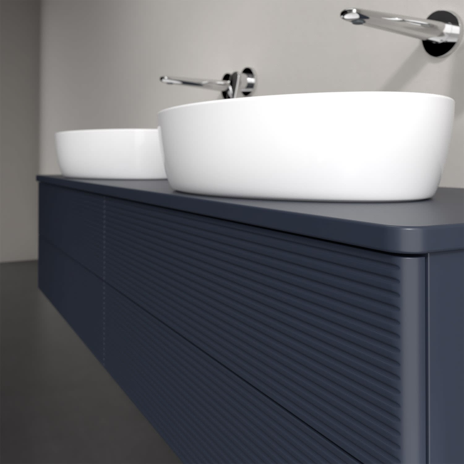 Der wandhängende Antao Waschtischunterschrank für zwei Aufsatzwaschtische bietet mit seinen vier Auszügen und seiner erstaunlichen Größe viel Platz zum Verstauen von Utensilien im Badezimmer. Inspiriert von der Natur überzeugt der Unterschrank auch optisch mit sanfter Formsprache und abgerundete Kanten. Die grifflosen Auszüge mit strukturierter Front sind mit der Push-to-Open Funktion ausgestattet und verfügen über einen Antirutschboden, damit Utensilien sicher verstaut werden können. Mit seiner Vollauszug- und Selbsteinzug-Funktion ist der Schrank praktisch und leicht zu bedienen. Qualität von Villeroy & Boch! Für eine besonders leichte Pflege sorgt die mehrschichtig deckend lackierte Oberfläche.