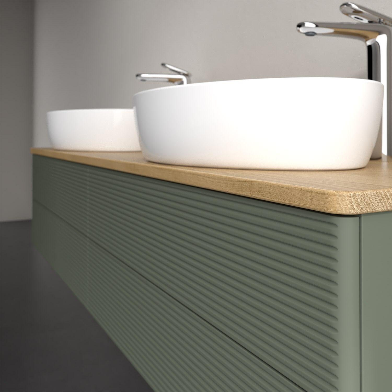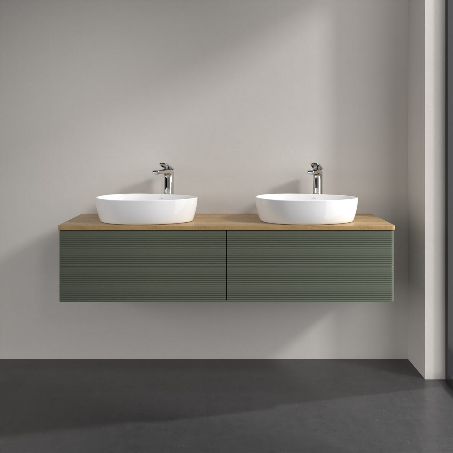 Der wandhängende Antao Waschtischunterschrank für zwei Aufsatzwaschtische bietet mit seinen vier Auszügen und seiner erstaunlichen Größe viel Platz zum Verstauen von Utensilien im Badezimmer. Inspiriert von der Natur überzeugt der Unterschrank auch optisch mit sanfter Formsprache und abgerundete Kanten. Die grifflosen Auszüge mit strukturierter Front sind mit der Push-to-Open Funktion ausgestattet und verfügen über einen Antirutschboden, damit Utensilien sicher verstaut werden können. Mit seiner Vollauszug- und Selbsteinzug-Funktion ist der Schrank praktisch und leicht zu bedienen. Qualität von Villeroy & Boch! Für eine besonders leichte Pflege sorgt die mehrschichtig deckend lackierte Oberfläche. Bei der Ausführung in Massivholz wird dank des verarbeiteten Massivholzes jedes Möbel zu einem Unikat, das sich durch das lebendige Naturmaterial durch seine einzigartige Struktur und Maserung auszeichnet.