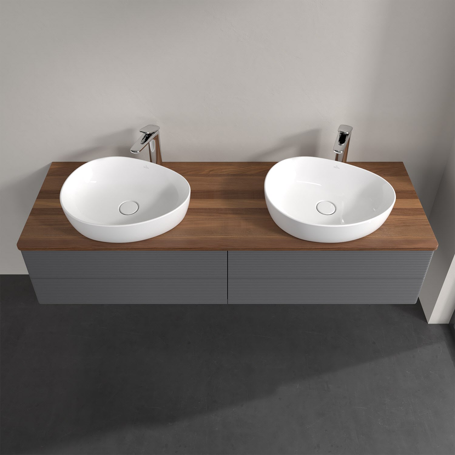 Der wandhängende Antao Waschtischunterschrank für zwei Aufsatzwaschtische bietet mit seinen vier Auszügen und seiner erstaunlichen Größe viel Platz zum Verstauen von Utensilien im Badezimmer. Inspiriert von der Natur überzeugt der Unterschrank auch optisch mit sanfter Formsprache und abgerundete Kanten. Die grifflosen Auszüge mit strukturierter Front sind mit der Push-to-Open Funktion ausgestattet und verfügen über einen Antirutschboden, damit Utensilien sicher verstaut werden können. Mit seiner Vollauszug- und Selbsteinzug-Funktion ist der Schrank praktisch und leicht zu bedienen. Qualität von Villeroy & Boch! Für eine besonders leichte Pflege sorgt die mehrschichtig deckend lackierte Oberfläche. Bei der Ausführung in Massivholz wird dank des verarbeiteten Massivholzes jedes Möbel zu einem Unikat, das sich durch das lebendige Naturmaterial durch seine einzigartige Struktur und Maserung auszeichnet.