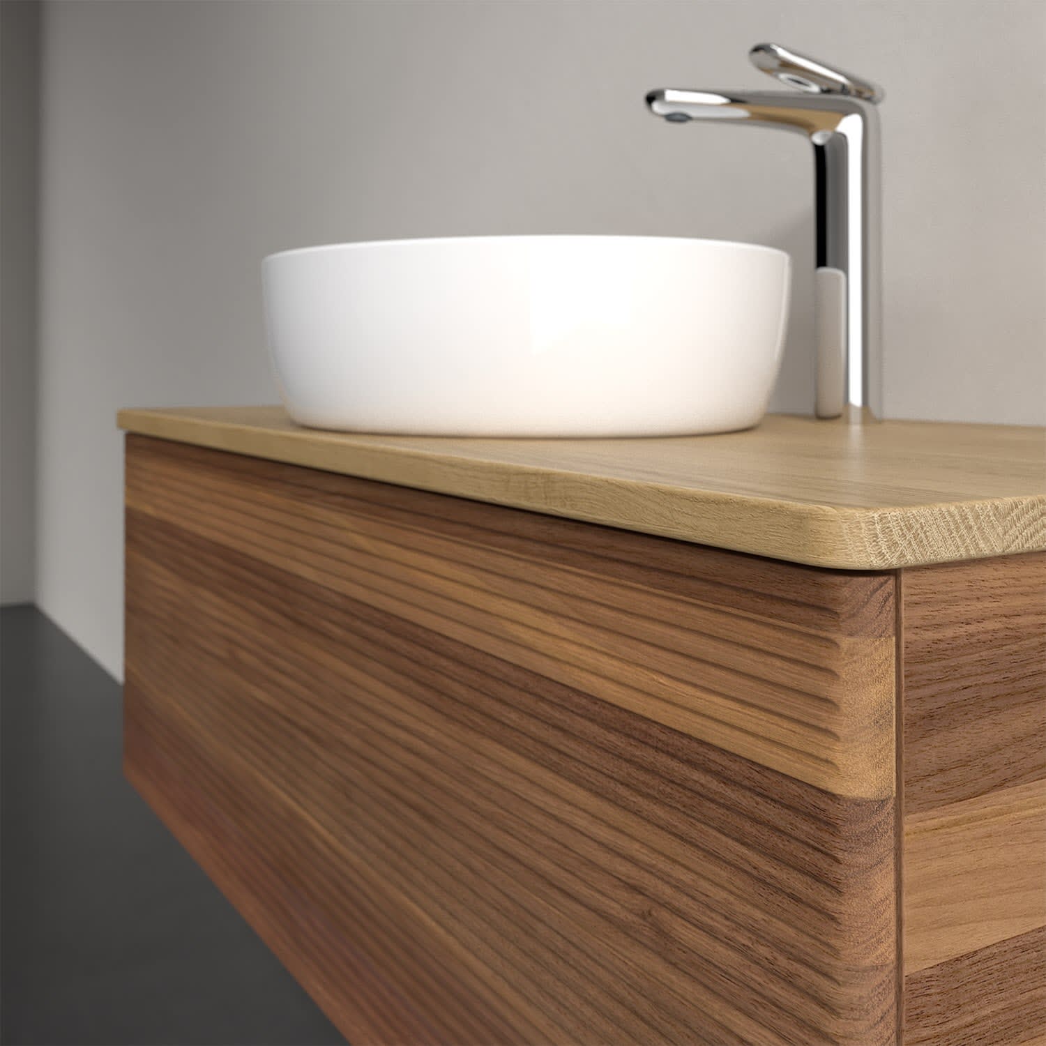 Mit dem wandhängenden Antao Waschtischunterschrank entscheidet man sich für eine hochwertige und praktische Stauraumlösung, die viel Freude bereitet. Die Funktionen sind besonders gut durchdacht: Im Inneren der beiden extra hohen und vollausziehbaren Auszüge können Handtücher, Kosmetik oder andere Pflegeprodukte dank des Antirutschbodens bequem aufbewahrt werden. Geöffnet wird das Möbel durch leichten Druck auf die strukturierte Front. Natürlich verfügen die Auszüge über eingebaute Dämpfer, die sie anschließend wieder sanft und leise schließen lassen. Auch auf der Waschtischplatte finden die wichtigsten Utensilien seitlich des Waschtischs genügend Platz. Optisch sorgt der Unterschrank von Villeroy & Boch mit seinen abgerundeten Kanten für ein modernes, gemütliches Ambiente. Für eine besonders leichte Pflege sorgt die mehrschichtig deckend lackierte Oberfläche. Bei der Ausführung in Massivholz wird dank des verarbeiteten Massivholzes jedes Möbel zu einem Unikat, das sich durch das lebendige Naturmaterial durch seine einzigartige Struktur und Maserung auszeichnet.