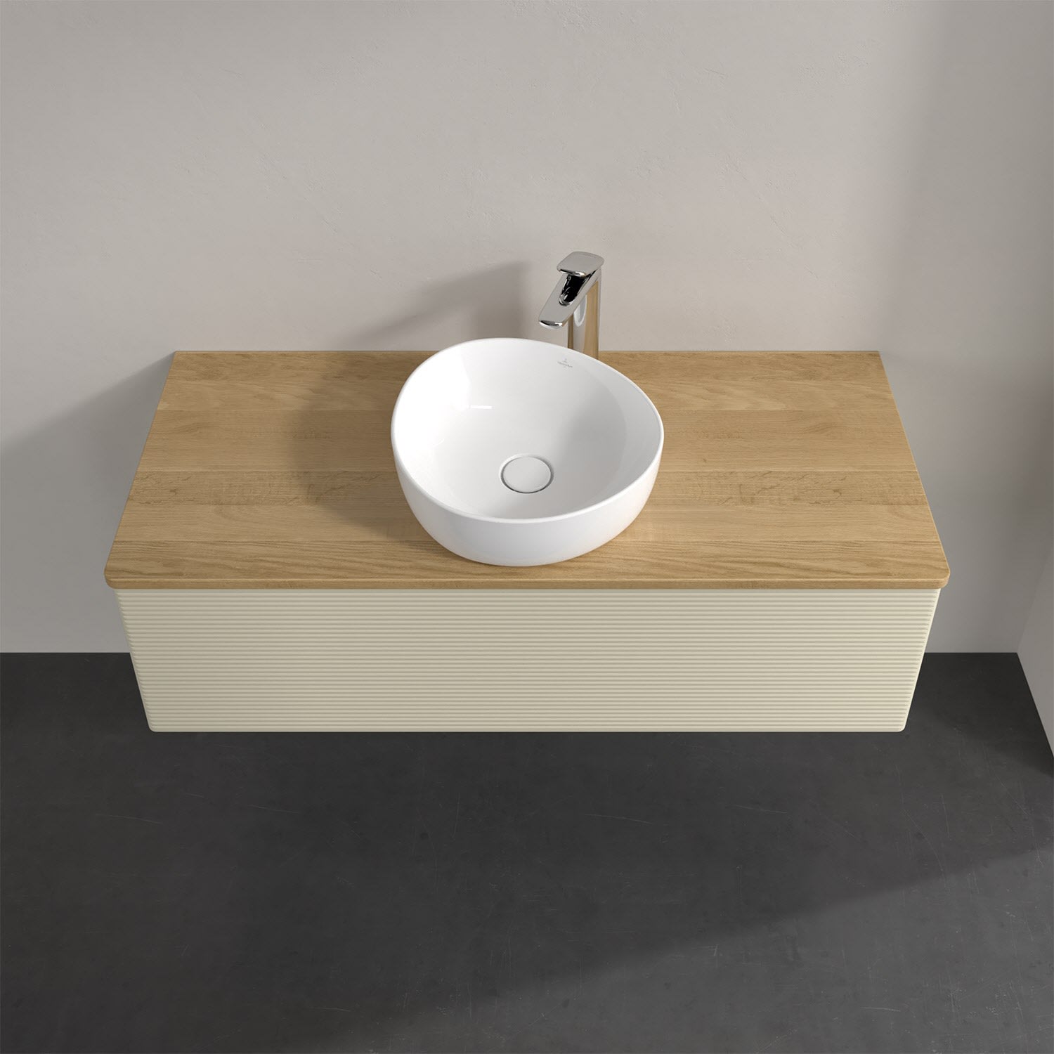 Für diesen Waschbeckenunterschrank stehen Ihnen Aufsatzwaschtische aus verschiedenen Serien zur Verfügung (siehe "Passliste" unter Downloads). Ein ausgewähltes Beispiel finden Sie im Zubehör. Den Waschtisch bitte separat mitbestellen.