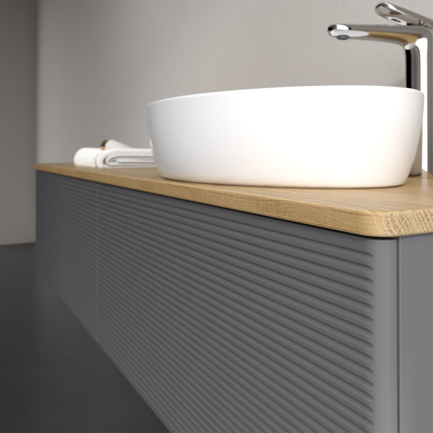 Der wandhängende Antao Waschtischunterschrank bietet mit seinen beiden extra hohen Auszügen und seiner erstaunlichen Größe viel Platz zum Verstauen von Utensilien im Badezimmer. Dank des seitlich platzierten Aufsatzwaschtischs gibt es daneben weiteren Platz für Handtücher, Seifenspender & Co. auf der Waschtischplatte. Inspiriert von der Natur überzeugt der Unterschrank auch optisch mit sanfter Formsprache und abgerundete Kanten. Die grifflosen Auszüge mit strukturierter Front sind mit der Push-to-Open Funktion ausgestattet und verfügen über einen Antirutschboden, damit Utensilien sicher verstaut werden können. Mit seiner Vollauszug- und Selbsteinzug-Funktion ist der Schrank praktisch und leicht zu bedienen. Qualität von Villeroy & Boch! Für eine besonders leichte Pflege sorgt die mehrschichtig deckend lackierte Oberfläche. Bei der Ausführung in Massivholz wird dank des verarbeiteten Massivholzes jedes Möbel zu einem Unikat, das sich durch das lebendige Naturmaterial durch seine einzigartige Struktur und Maserung auszeichnet.