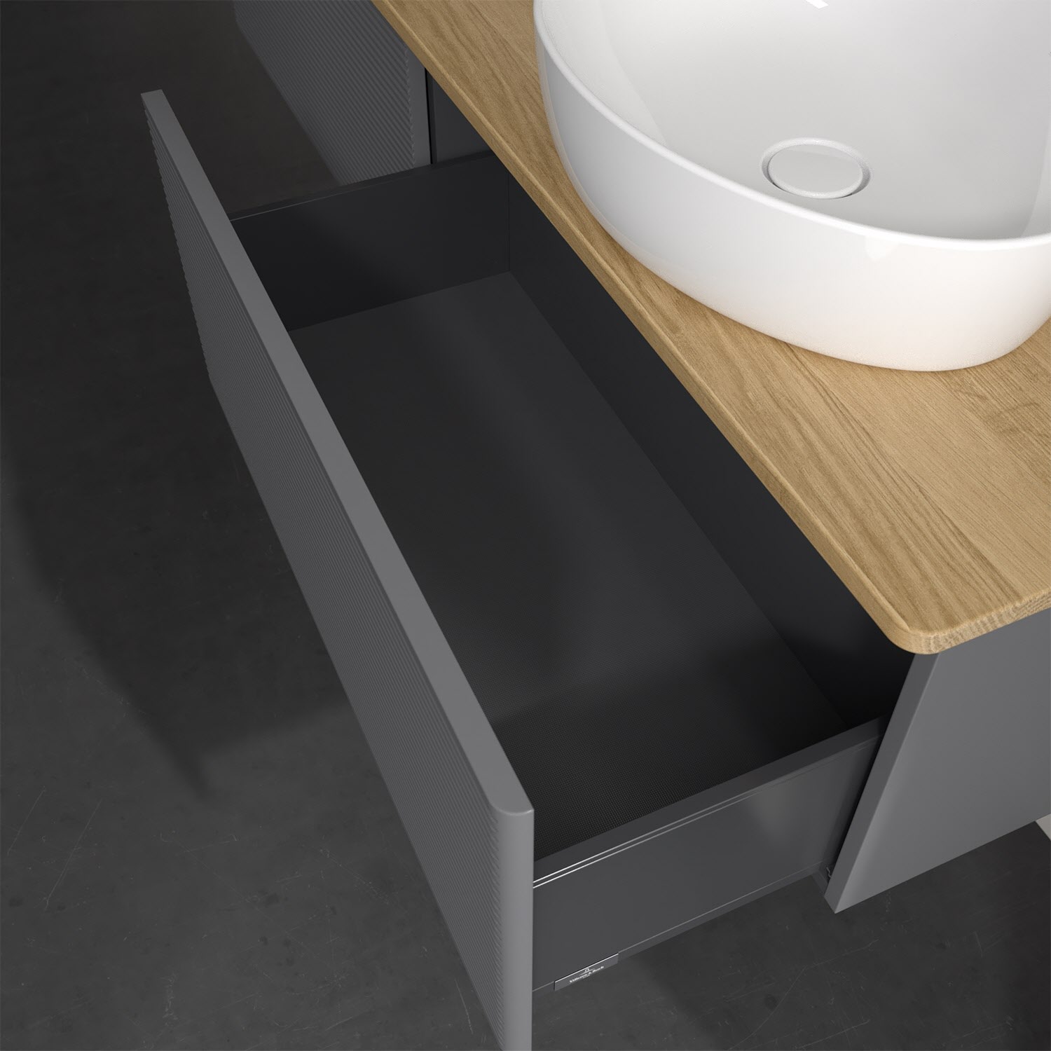 Villeroy & Boch Antao Waschbeckenunterschrank, 160 x 36 cm, 2 Auszüge, Front mit Struktur, mit Hahnloch, für Waschtisch rechts