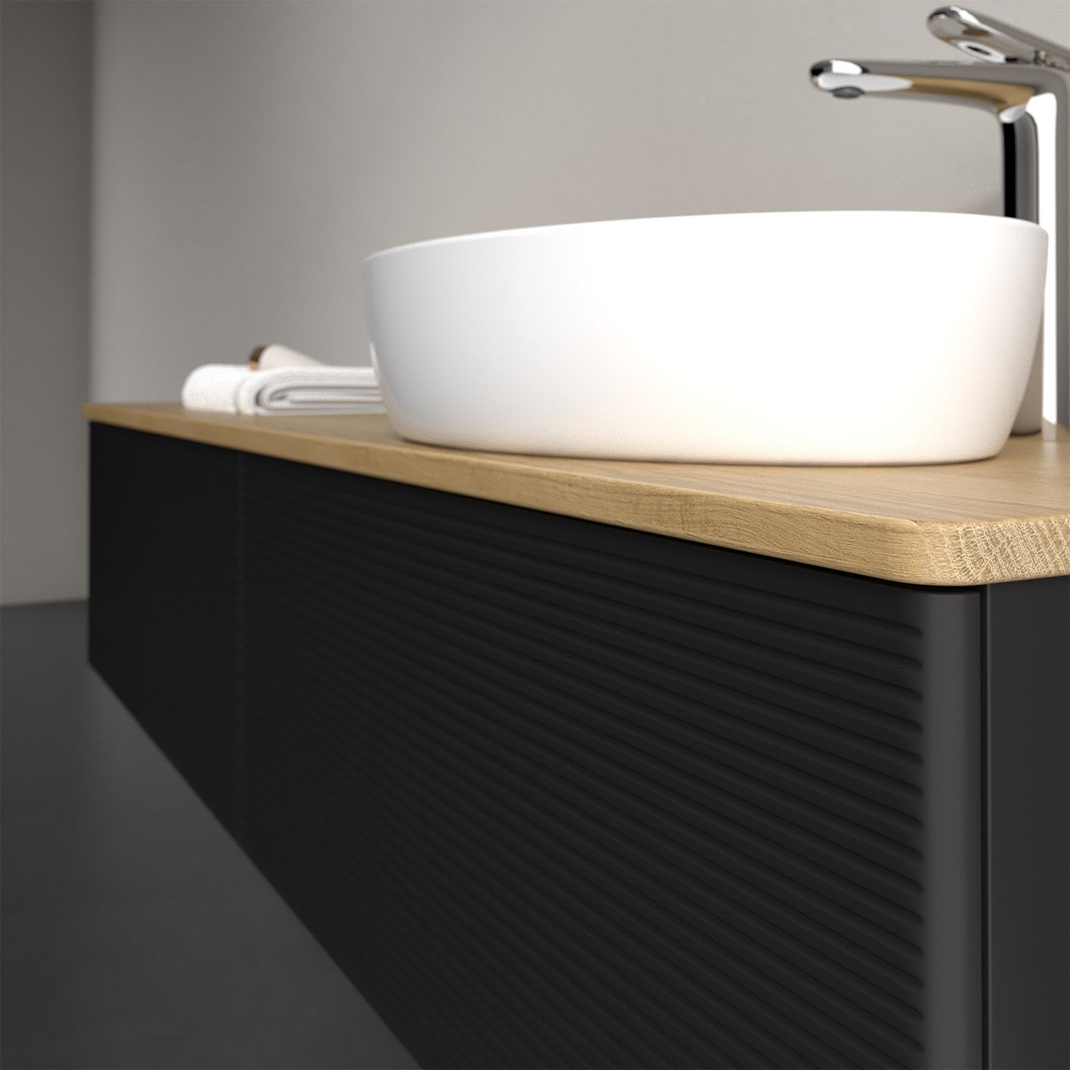 Für diesen Waschbeckenunterschrank stehen Ihnen Aufsatzwaschtische aus verschiedenen Serien zur Verfügung (siehe "Passliste" unter Downloads). Ein ausgewähltes Beispiel finden Sie im Zubehör. Den Waschtisch bitte separat mitbestellen.
