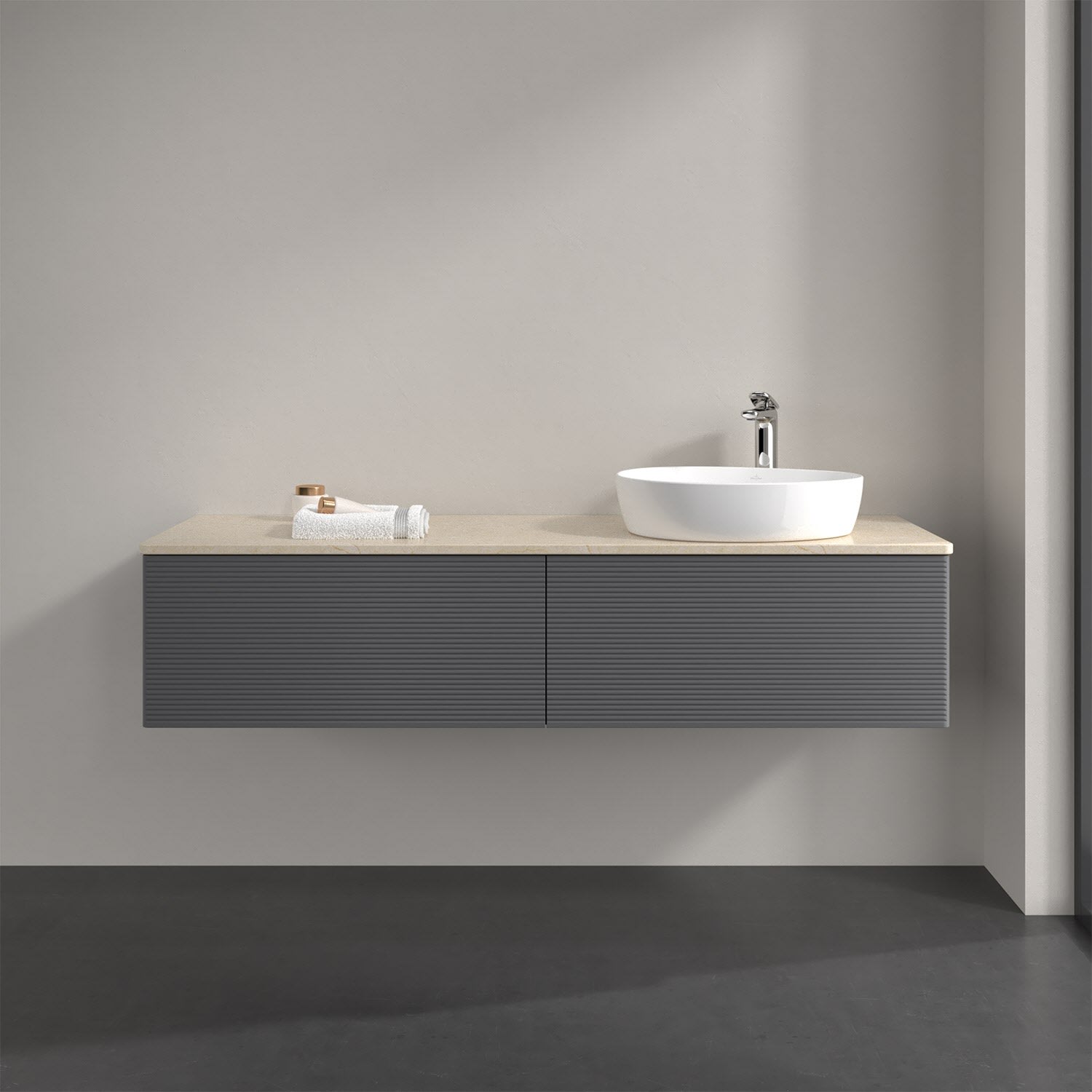 Villeroy & Boch Antao Waschbeckenunterschrank, 160 x 36 cm, 2 Auszüge, Front mit Struktur, mit Hahnloch, für Waschtisch rechts