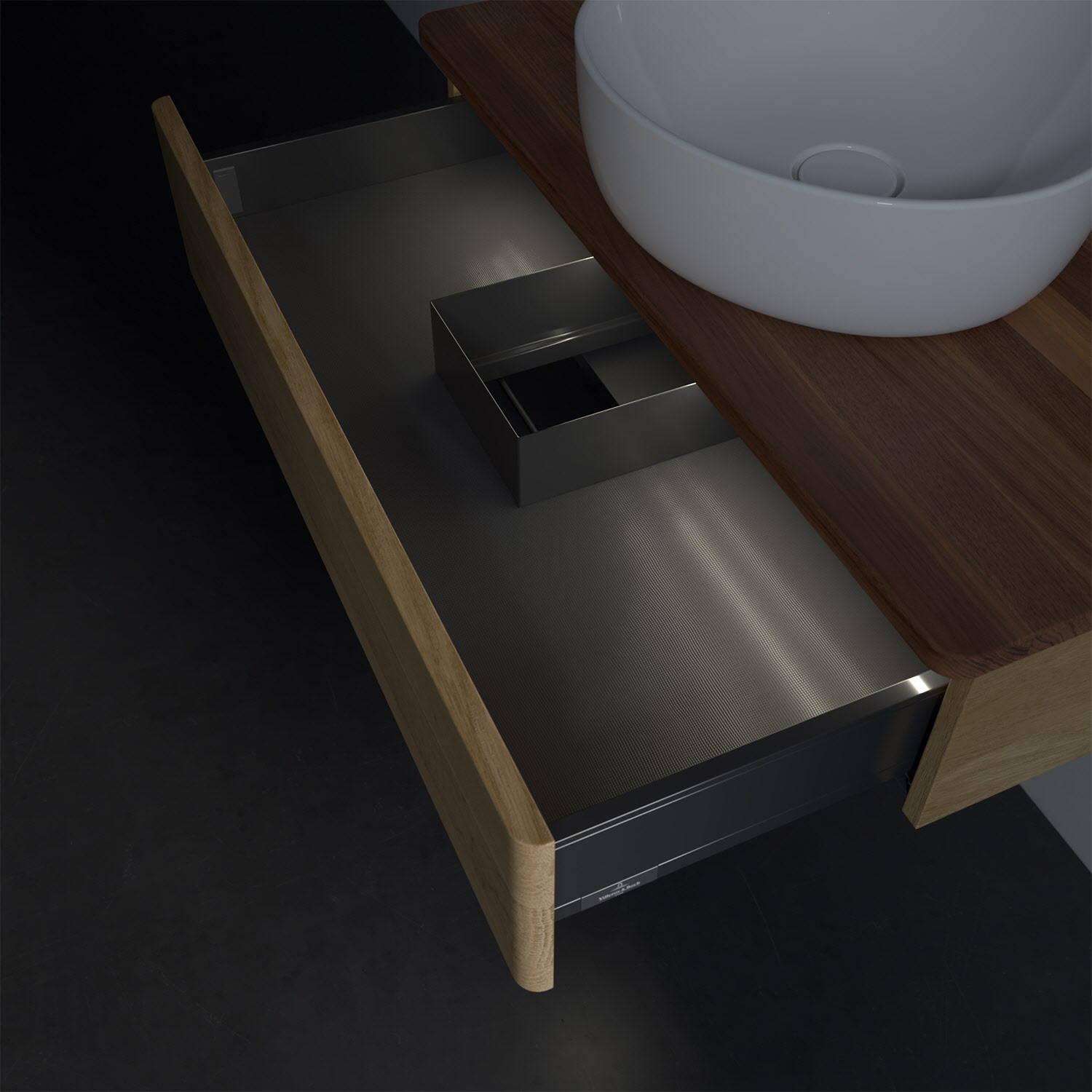 - in Schublade integrierte LED-Leiste mit warmweißem Licht zur Beleuchtung des Innenlebens